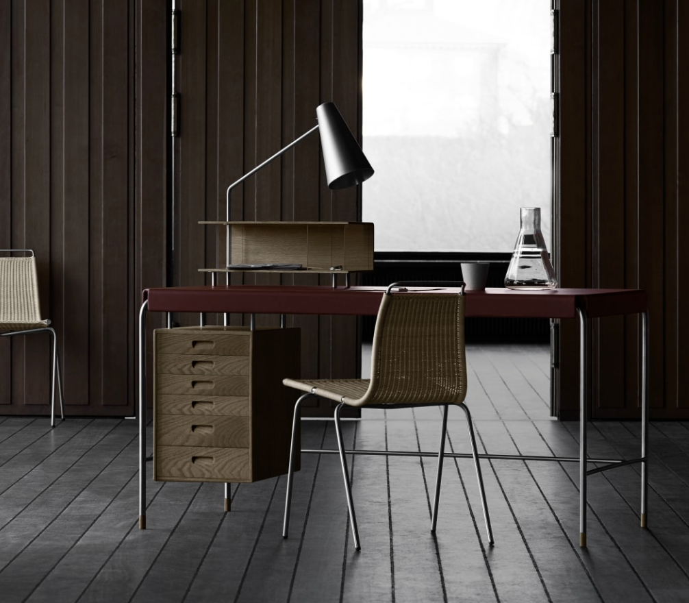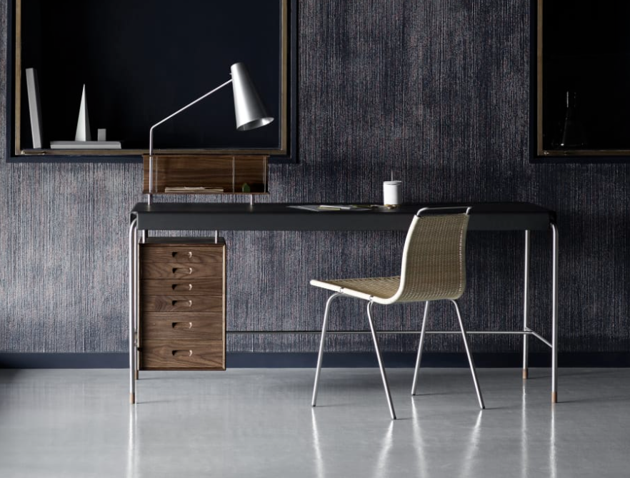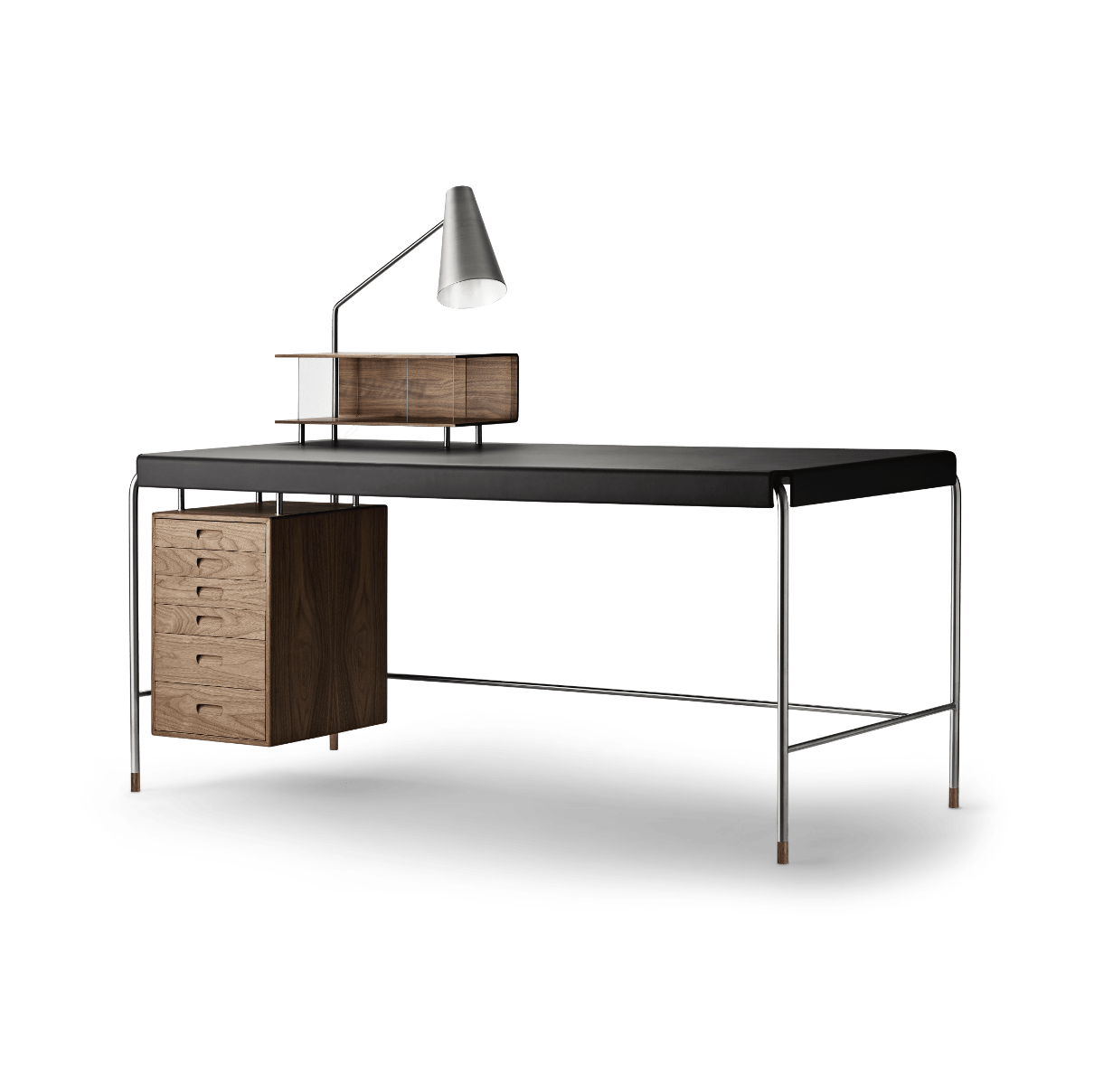 Arne Jacobsen 的 AJ52 Society Table 誕生于 1952 年,正值他職業(yè)生涯的巔峰時期,它是丹麥建筑師功能主義設計方法的永恒典范。雅各布森利用新技術和新材料打造了這款纖細的寫字臺,其特點是結構精細的皮革桌面緊緊包裹著管狀金屬框架。拉絲不銹鋼制成的錐形臺燈是該設計的無縫延伸,玻璃正面、木質和單板字母隔間也是如此。桌子下方有一個同樣采用木材和單板制成的六抽屜單元,懸掛在細金屬管上,這一特點與纖細的框架和實木腳一起,為桌子增添了輕盈的氣息。AJ52 Society 表有兩種尺寸可供選擇,帶或不帶桌面隔間和臺燈。這是兩者中較大的一個,尺寸為 160 x 70 厘米。六抽屜單元可以安裝在桌子的左側或右側下方;有實心橡木、胡桃木或黑漆橡木抽屜和配套腳可供選擇。