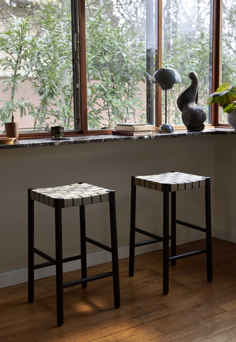 這款凳子以哥本哈根的 Betty Nansen 劇院命名,其堅(jiān)固的框架由涂漆橡木制成。網(wǎng)狀座椅的帶子由天然亞麻纖維制成,手工編織而成,提供柔軟的緩沖底座。Betty 凳子有兩種高度可供選擇,有四種顏色組合可供選擇: 栗色漆面白蠟?zāi)荆瑤烊豢棊В粠烊豢棊У耐科釋?shí)心橡木;黑漆白蠟?zāi)?,天然織帶;和黑色漆面白蠟?zāi)敬钆浜谏棊А?