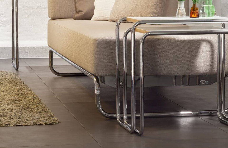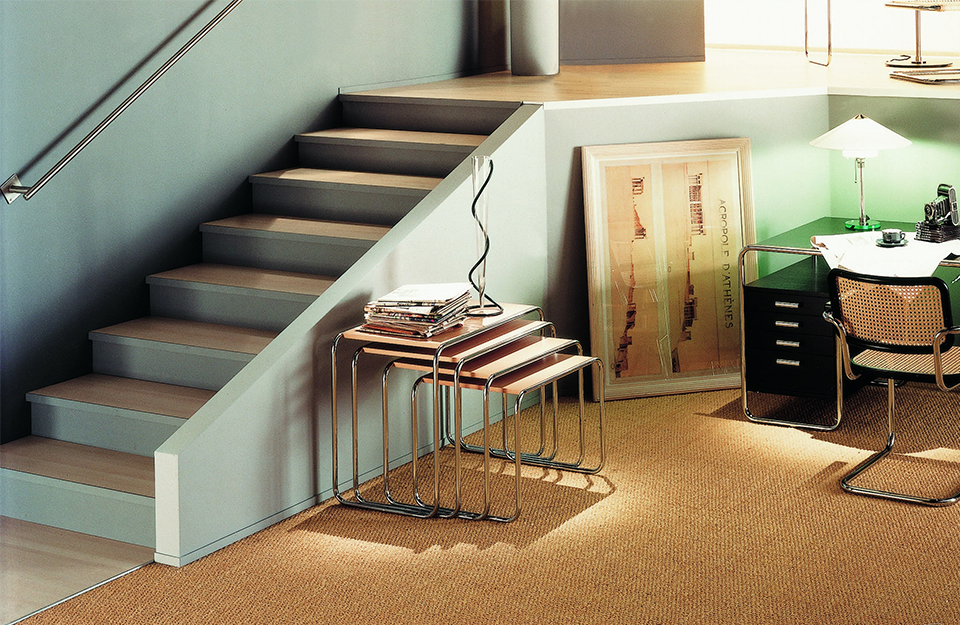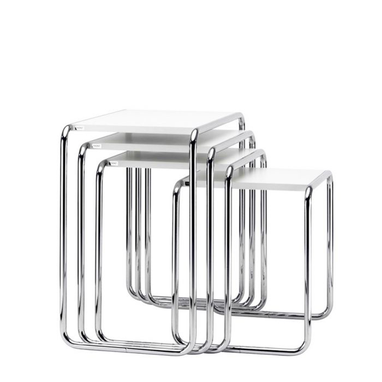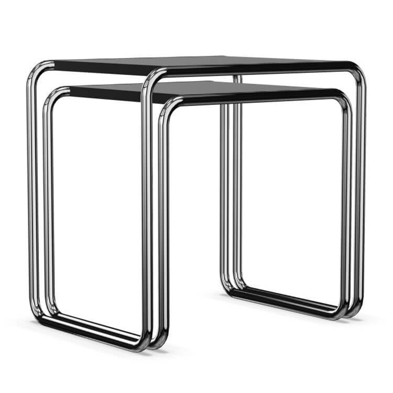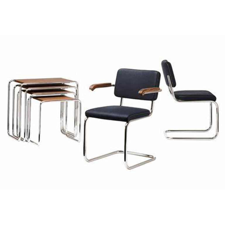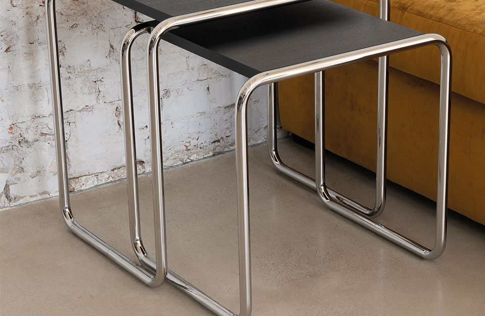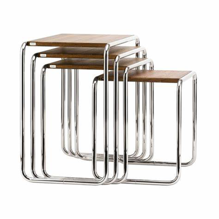 Michael Thonet完善的彎曲木技術是Marcel Breuer用彎曲鋼管進行實驗的靈感來源。四件套嵌套表B9就是基于這個想法開發(fā)的。這些小桌子有多種用途——可以作為座位組中的副桌、實用的儲物臺,也可以作為盛放鮮花的花瓶的理想場所。使用這些桌子后,它們可以以節(jié)省空間的方式輕松地推到另一張桌子下面。這一系列產(chǎn)品的特點是功能簡單——桌套僅由鍍鉻、彎曲鋼管和矩形面板組成。
