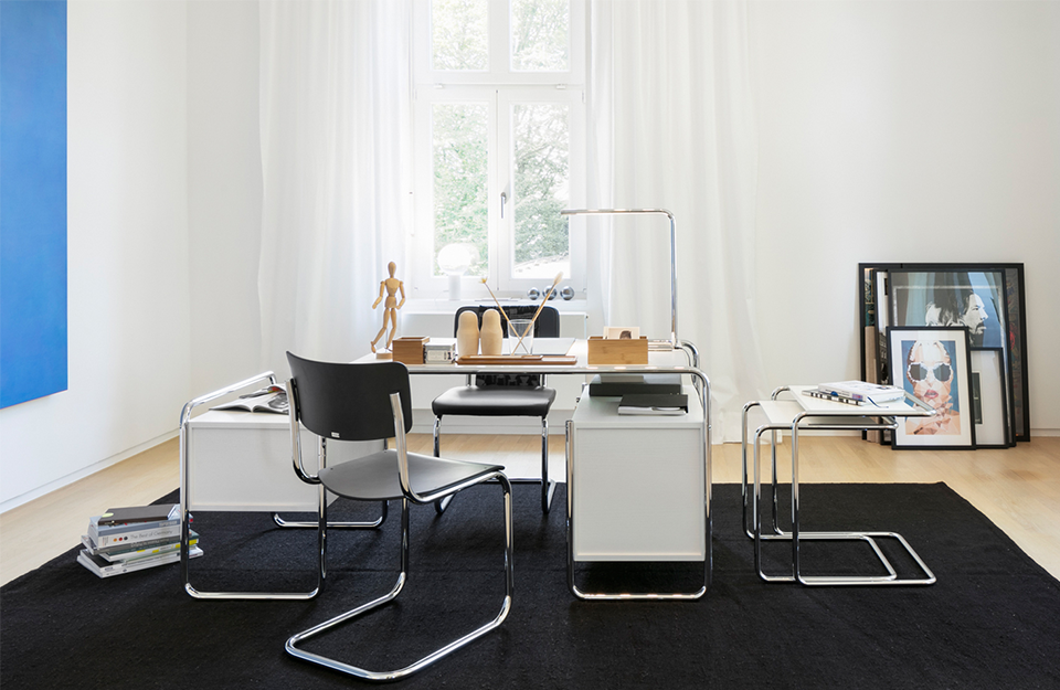 優(yōu)雅、靈活,適合多種用途。在尺寸上,表格集B97讓人想起Marcel Breuer的嵌套表格B9。然而,它經(jīng)過(guò)改造的結(jié)構(gòu)提供了一個(gè)實(shí)際優(yōu)勢(shì):由于一側(cè)有開(kāi)口,桌子可以拉到沙發(fā)、扶手椅或床的邊緣。它們也可以方便地相互推入。1933年的Thonet設(shè)計(jì)是管狀鋼家具的經(jīng)典之一。