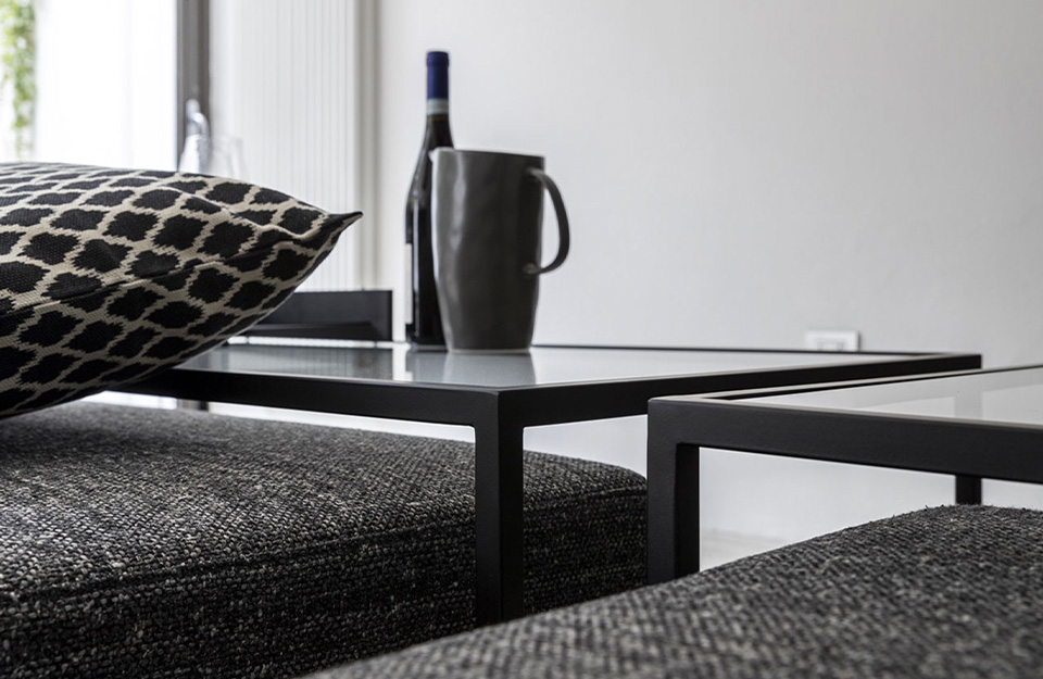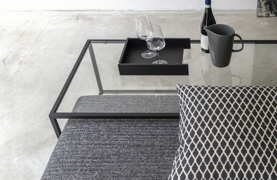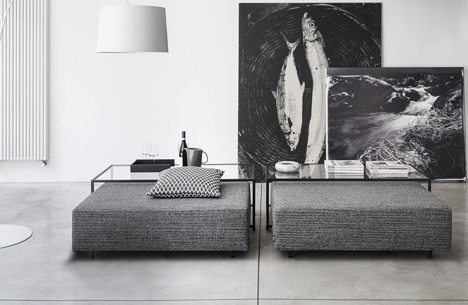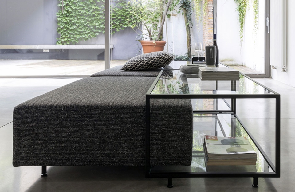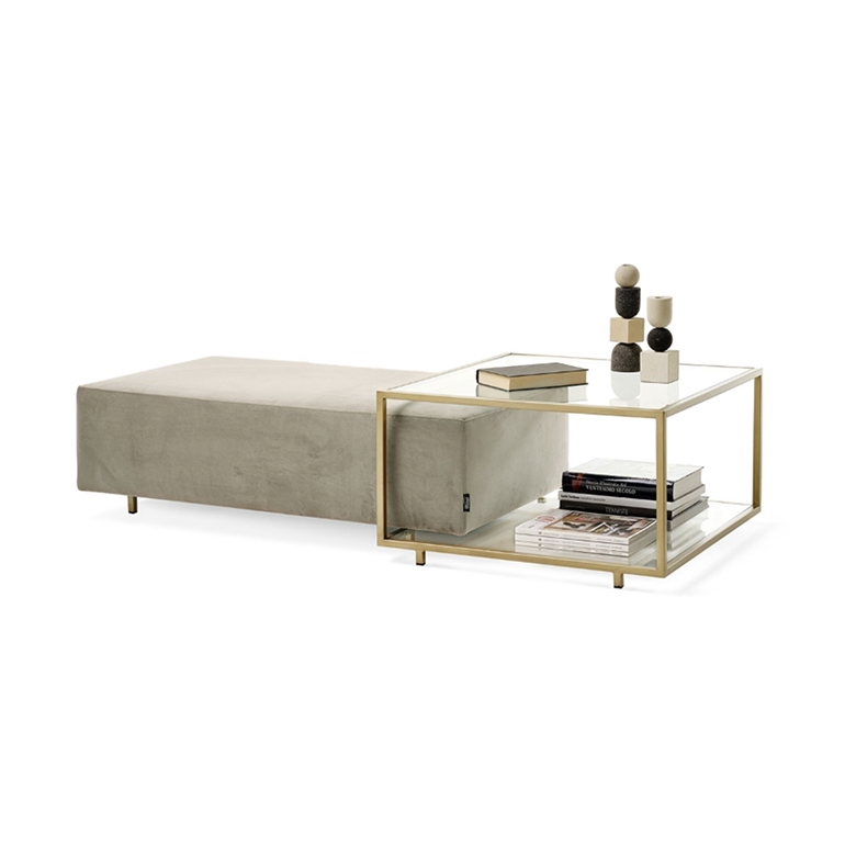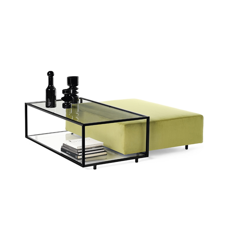 Zoom pouf配有可拆卸的蓋子,帶有金屬結(jié)構(gòu)的咖啡桌有古銅色或黑色漆面,并配有透明玻璃頂部。永恒的經(jīng)典,非常適合在起居區(qū)作為座位,同時(shí)作為咖啡桌。