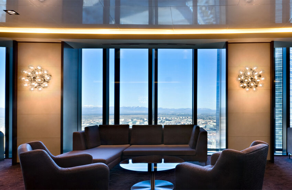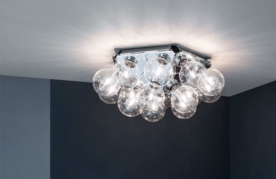 提供直接和反射照明的墻壁/天花板表面燈。結(jié)構(gòu)由5個(gè)壓制拋光鋁三角形組成。結(jié)構(gòu)周圍有15盞透明的Globolux燈。鋼天花板配件和玫瑰。