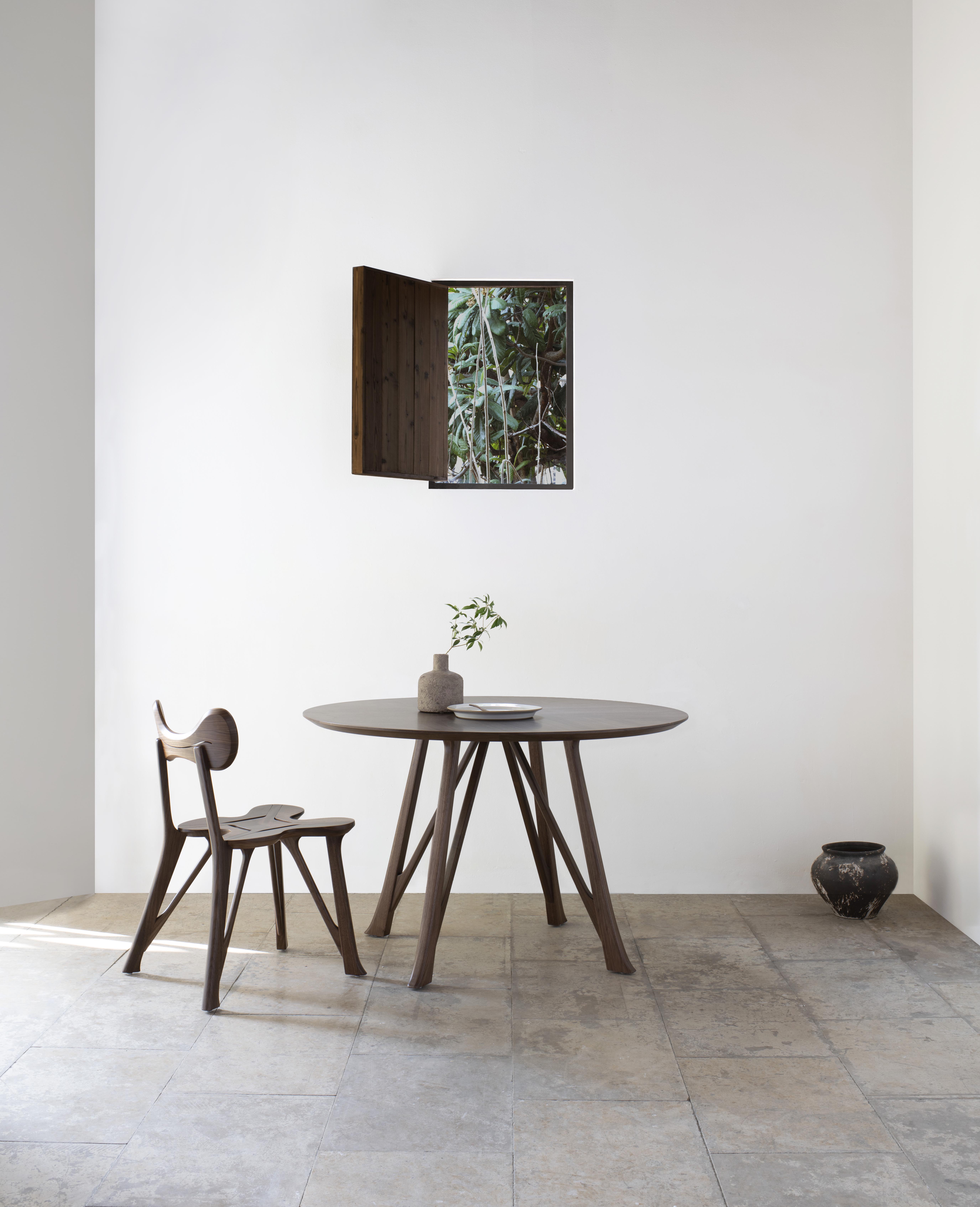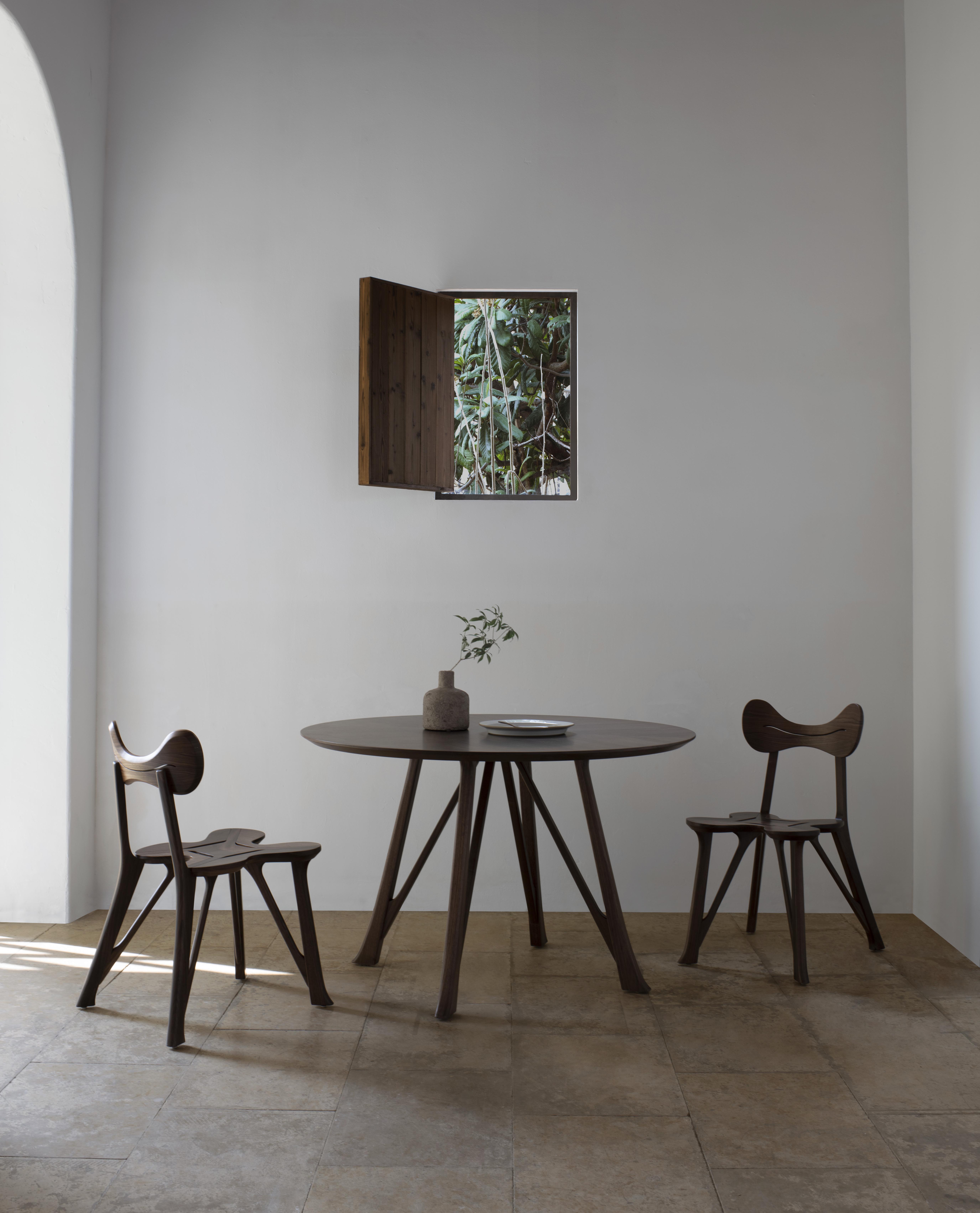 Stay 系列表達(dá)了對自然的敏感。該系列靈活、有趣且有機(jī)的結(jié)構(gòu)是消除多余元素的結(jié)果。桌子由四塊木頭制成,中心無縫連接,邊緣采用精致的斜角設(shè)計(jì)。椅子以四葉草的形式組成,延續(xù)了對自然形態(tài)的設(shè)計(jì)參考。