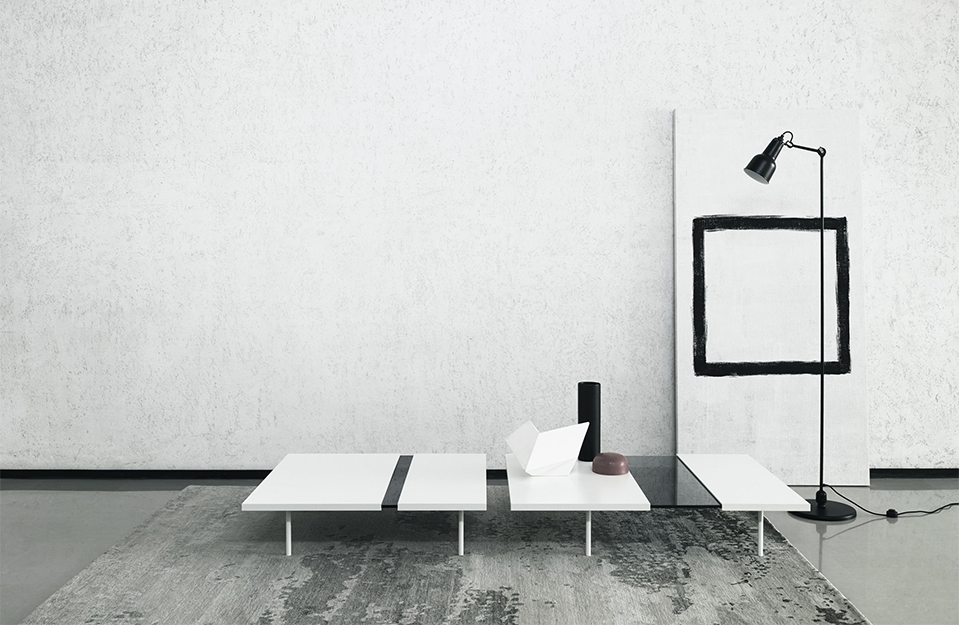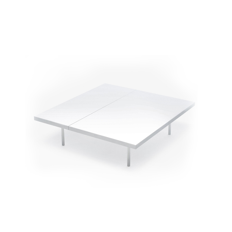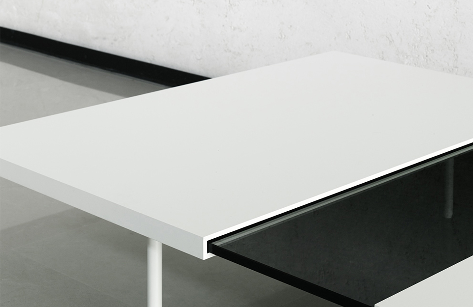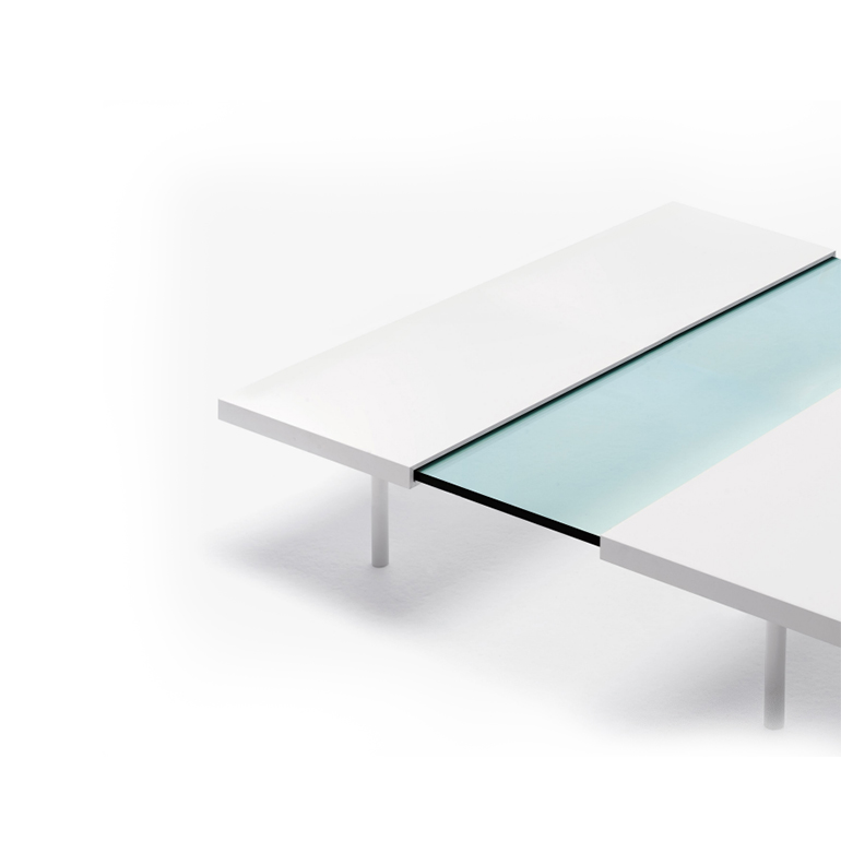 可伸展的咖啡桌,由透明的或煙熏的支撐制成鋼化玻璃頂部,12毫米厚,包含在兩個“殼”制成DOLUFLEX?的“折疊”,漆成白色的RAL-K7 9010。