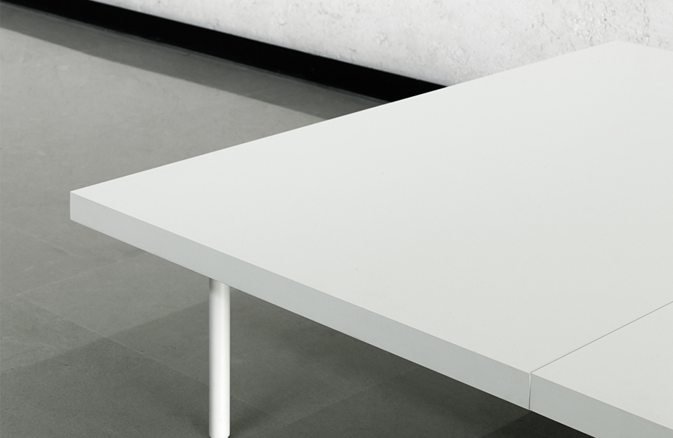 鋁板的下半部分被銑削以允許插入一步。設計馬里奧Ferrarini鋼桿腳。外殼裝有自潤滑的滑道材料,讓他們滑動。鋼桿腳?20mm h21,3cm,漆成白色的RAL-K7 9010,用螺絲固定在玻璃頂部襯套。地板支撐由黑色可調(diào)PVC腳固定。