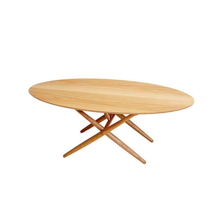 Ovalette Table將橢圓形桌面與戲劇性的交叉腿框架相結合,為任何房間增添了優(yōu)雅而引人注目的色彩。纖細的錐形腿讓人想起傳統(tǒng)的芬蘭設計,而它們的對角線設置吸引了人們的目光。Ilmari Tapiovaara希望確保他的設計輕巧且易于運輸;為此,桌面由樺木膠合板制成,帶有橡木或胡桃木貼面。