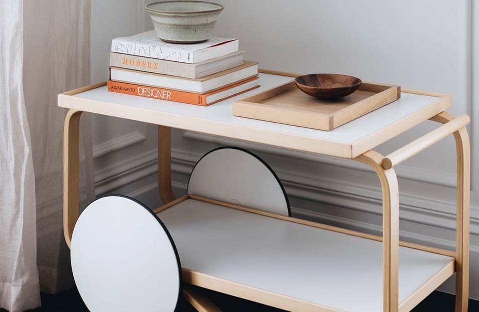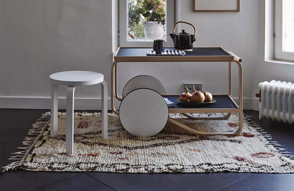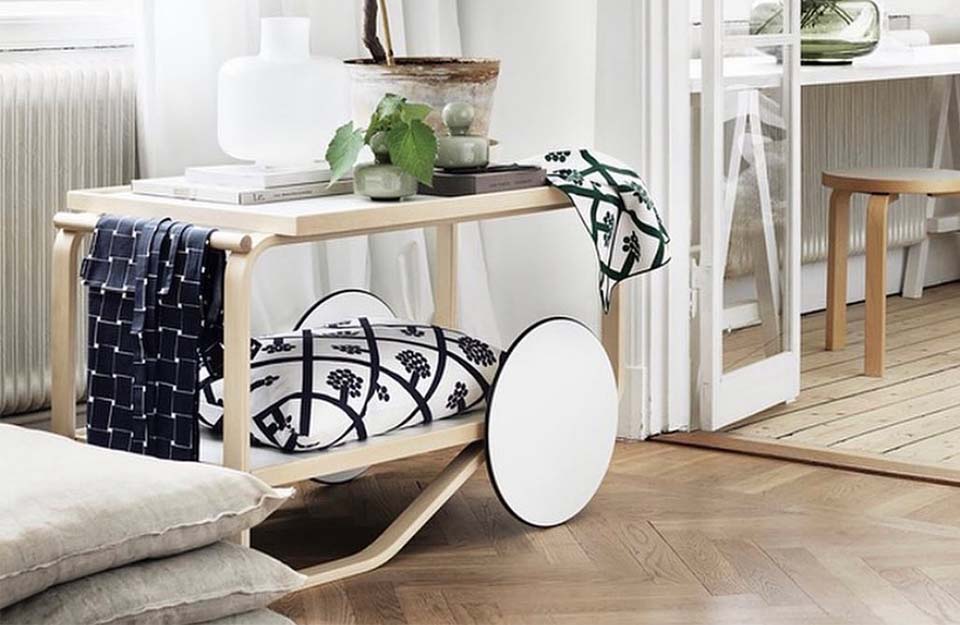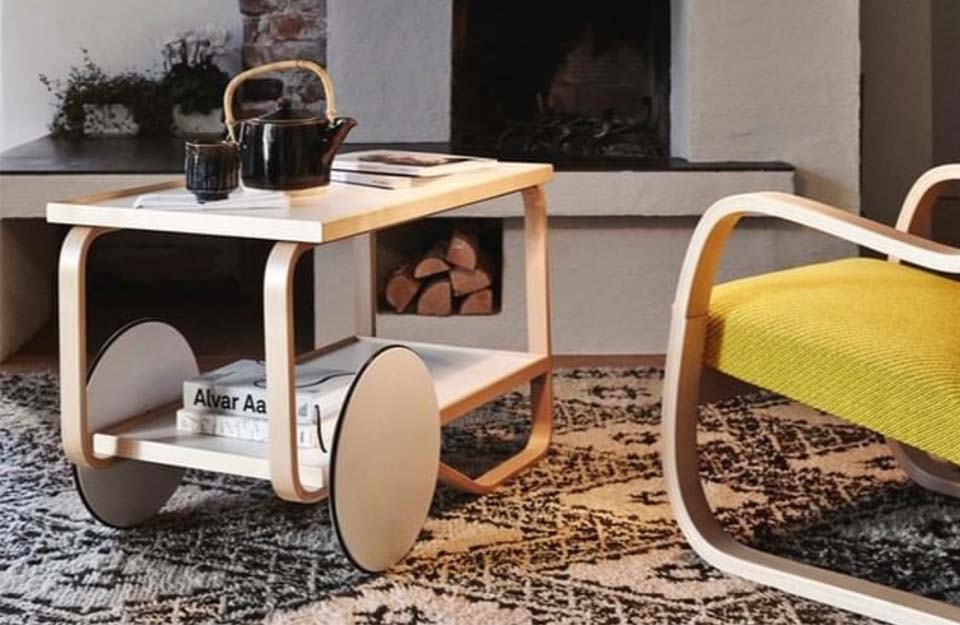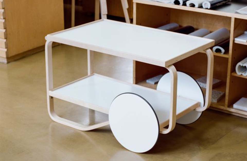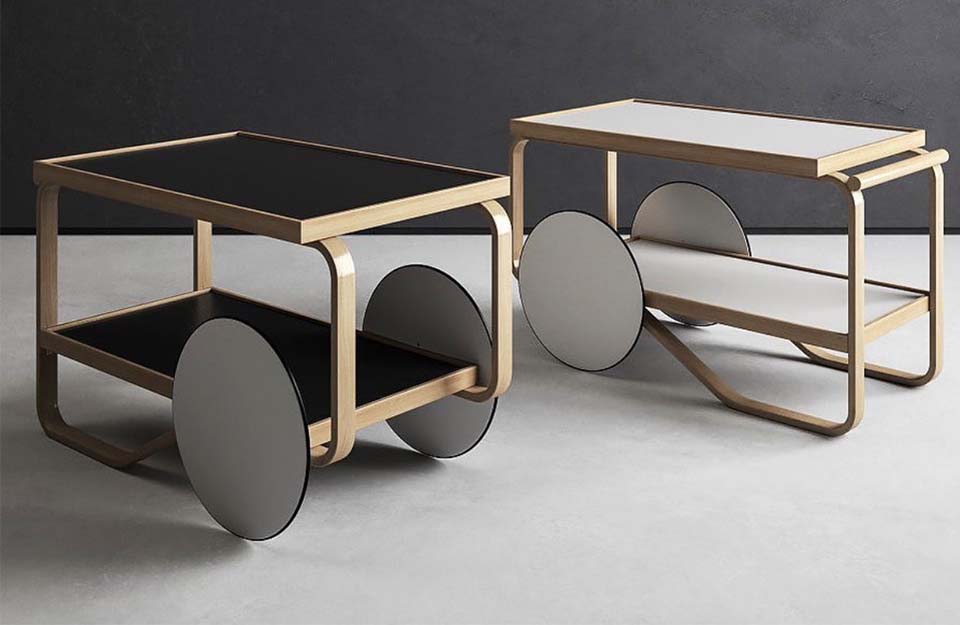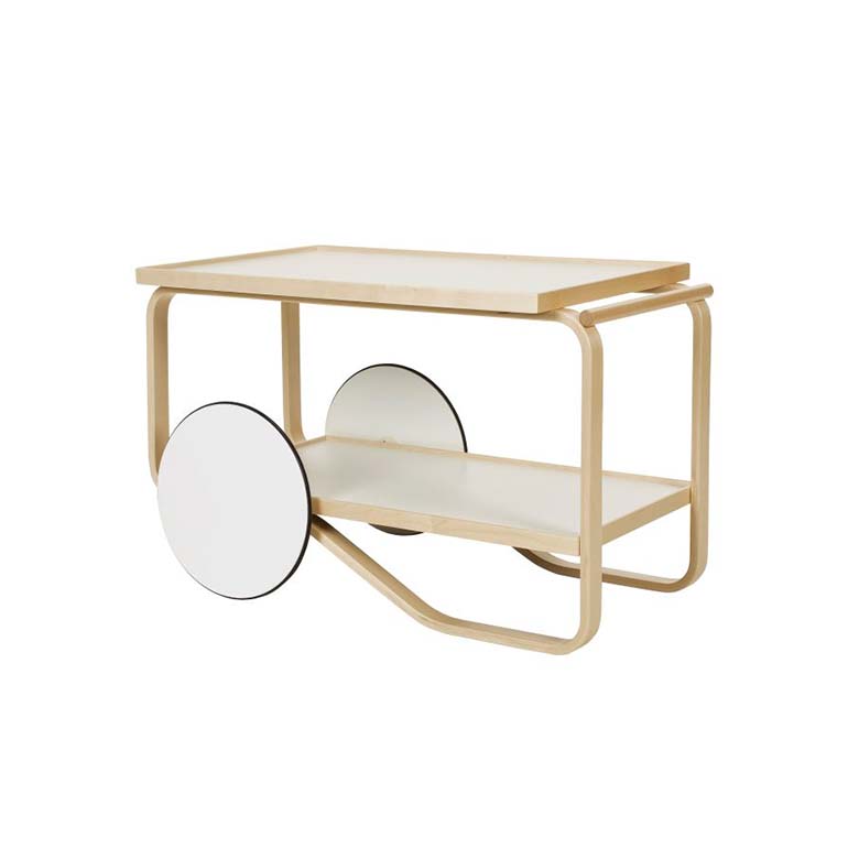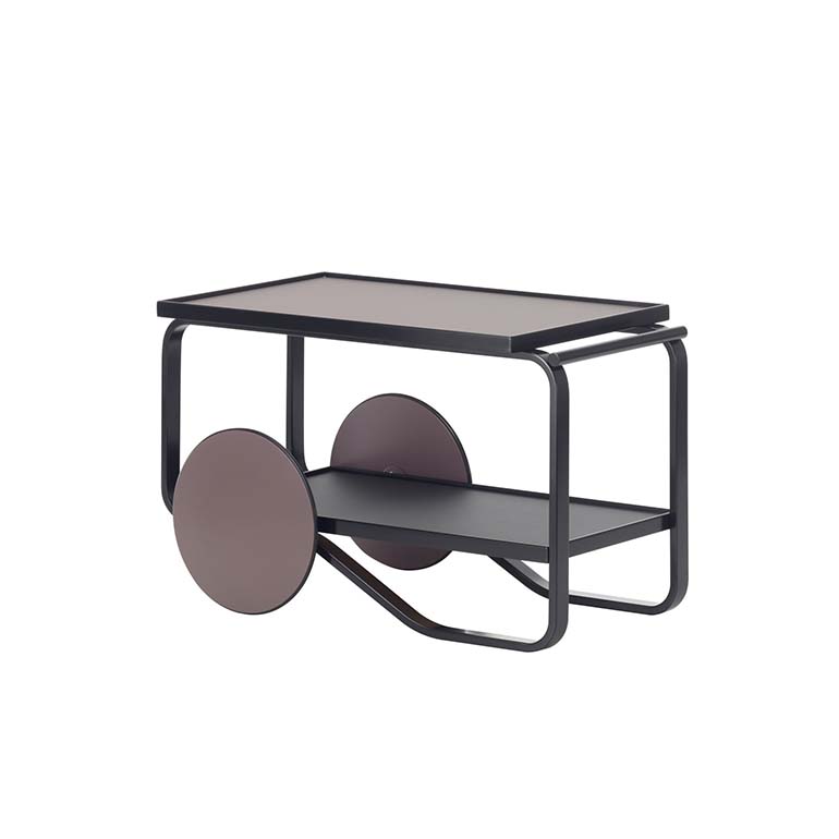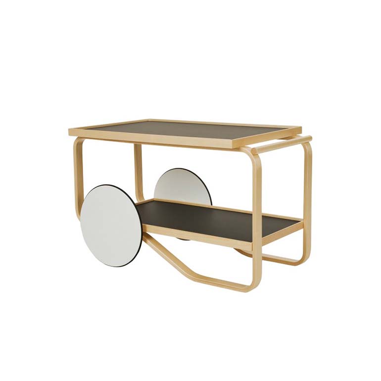 茶車的靈感來(lái)自英國(guó)茶文化,Aino和Alvar Aalto在多次旅行中都熟悉了這種文化,以及他們欽佩的日本木制品和建筑。Tea Trolley 901的框架由兩個(gè)樺木片環(huán)組成,配有兩個(gè)架子和一個(gè)堅(jiān)固的樺木手柄。雙輪與樺木的輕質(zhì)相結(jié)合,意味著手推車可以輕松隨意操縱和停放。多年來(lái),茶車已經(jīng)生產(chǎn)了許多變體。荷蘭設(shè)計(jì)師兼色彩專家Hella Jongerius深入研究了Artek的檔案,以提供她自己對(duì)Alvar Aalto最珍貴的產(chǎn)品之一的看法。她微妙的干預(yù)導(dǎo)致了深色版本的手推車,該手推車與產(chǎn)品上下托盤上的移位燈配合使用。