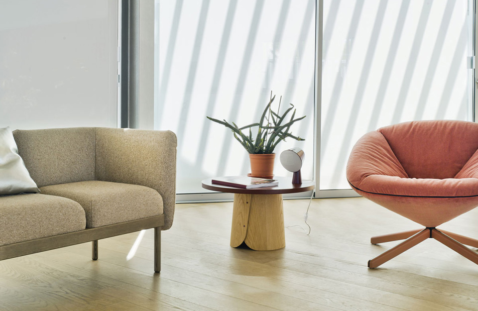 Tab是一個有2種不同高度的凳子和4張桌子。底座總是用彎曲的栗色單板,頂部有匹配的單板或各種漆。