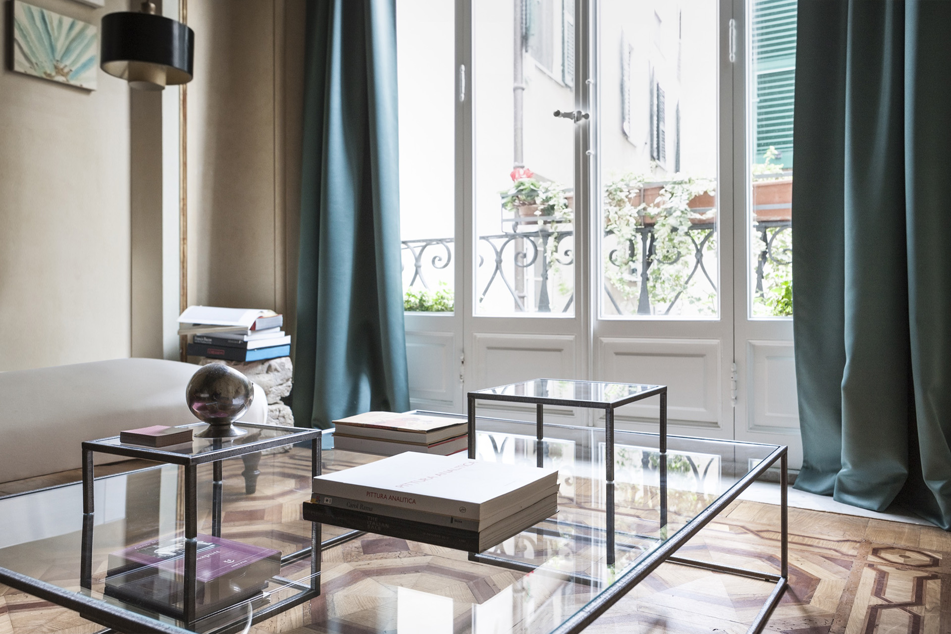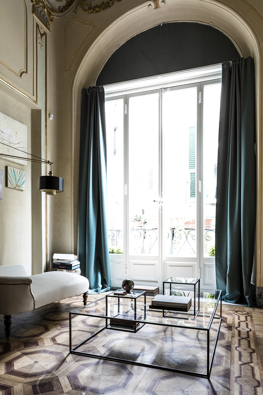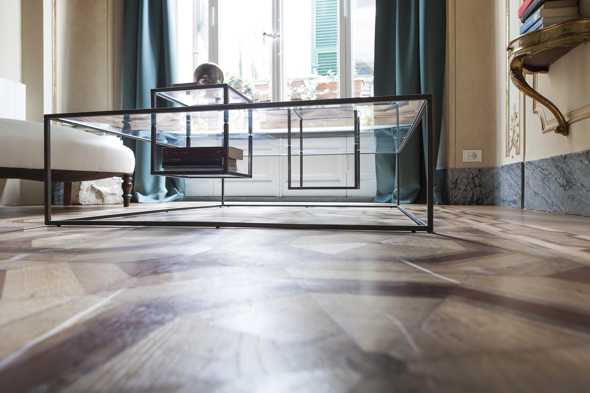 Illusioni 是一款采用黑鐵結(jié)構(gòu)和透明玻璃桌面的咖啡桌。體積似乎在波動,就像在沒有重力的情況下一樣;細長的結(jié)構(gòu)確立了其輕盈而基本的線條。