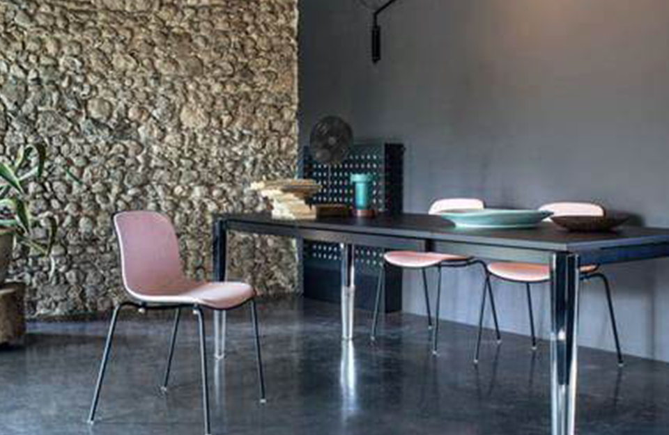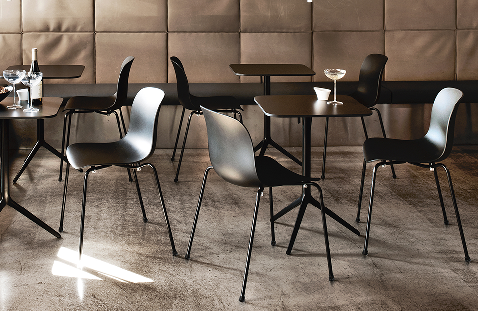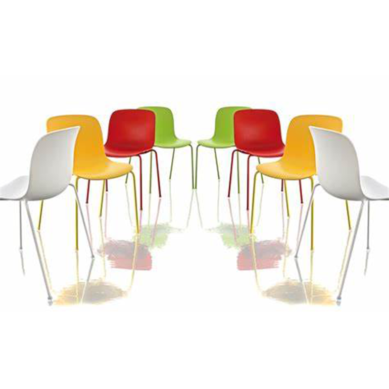 聚丙烯材質(zhì)的堆疊椅。 鋼管框架,鍍鉻或彈射處理,聚酯粉末噴涂。