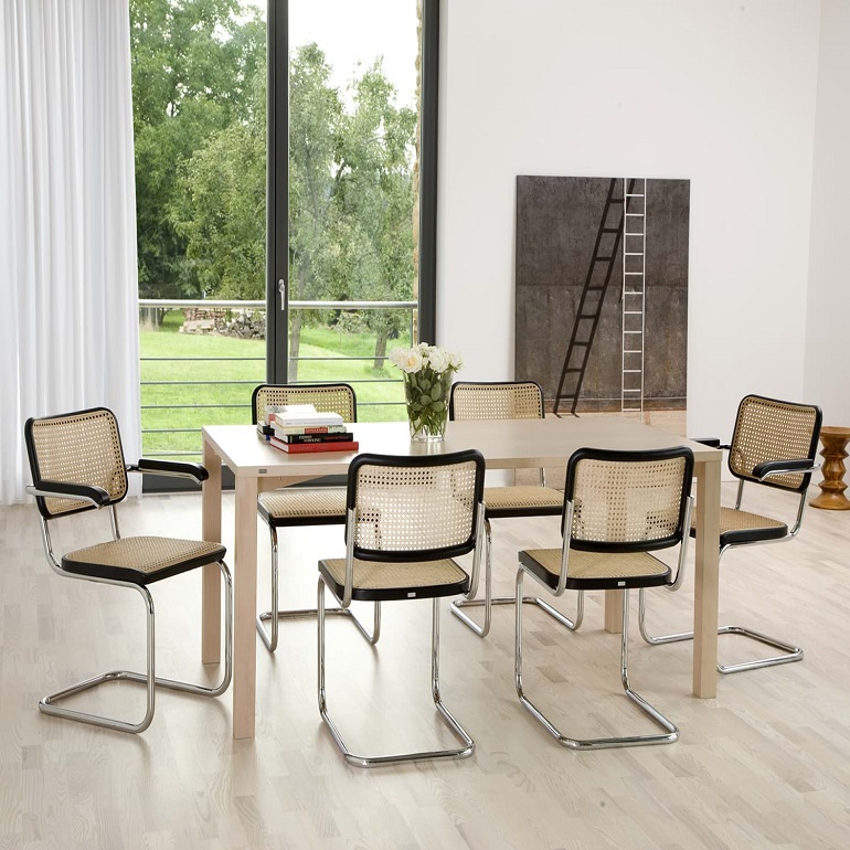 懸臂椅 S 32 和帶扶手的版本S 64是最著名的管狀鋼經典。新與舊的迷人結合促成了它們的受歡迎:Thonet 生產曲木家具的傳統(tǒng)與典型的維也納柳條製品相比,與管狀鋼的革命性使用形成鮮明對比。座椅和靠背由彎曲實木和柳條製成,代表傳統(tǒng),框架代表現(xiàn)在和未來。