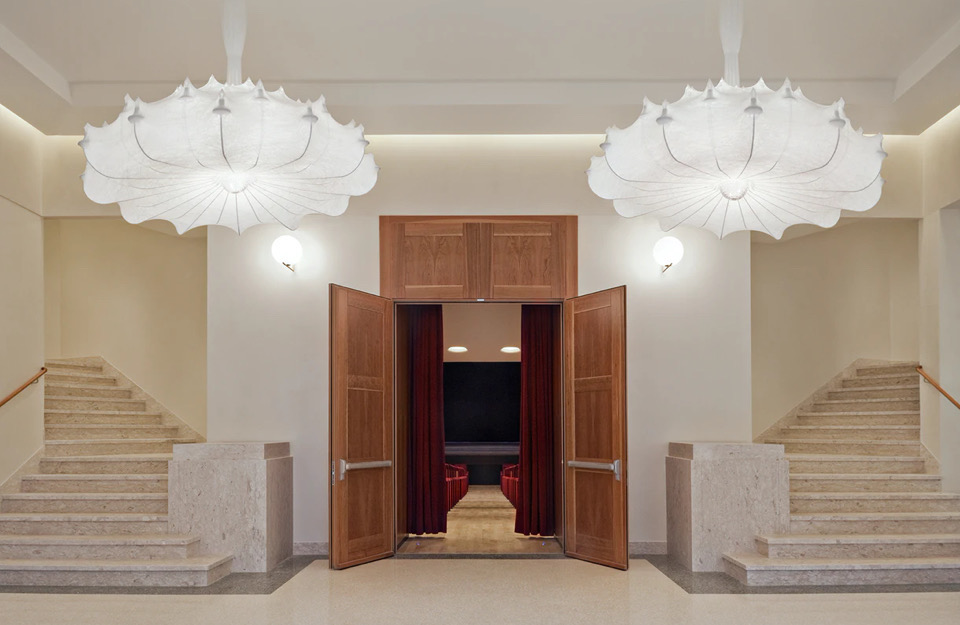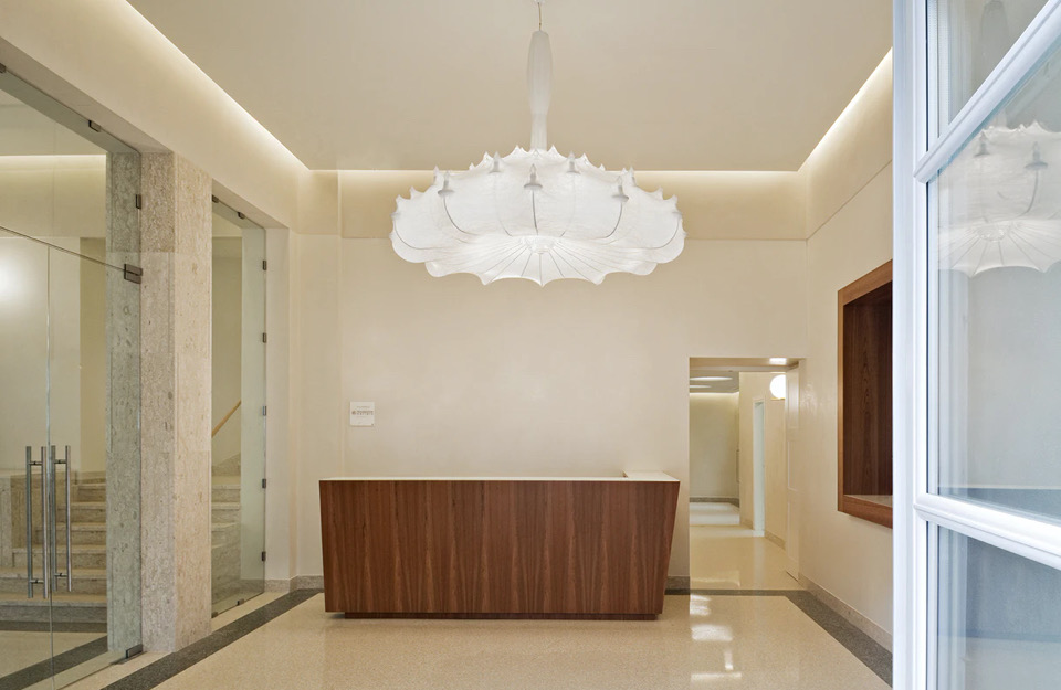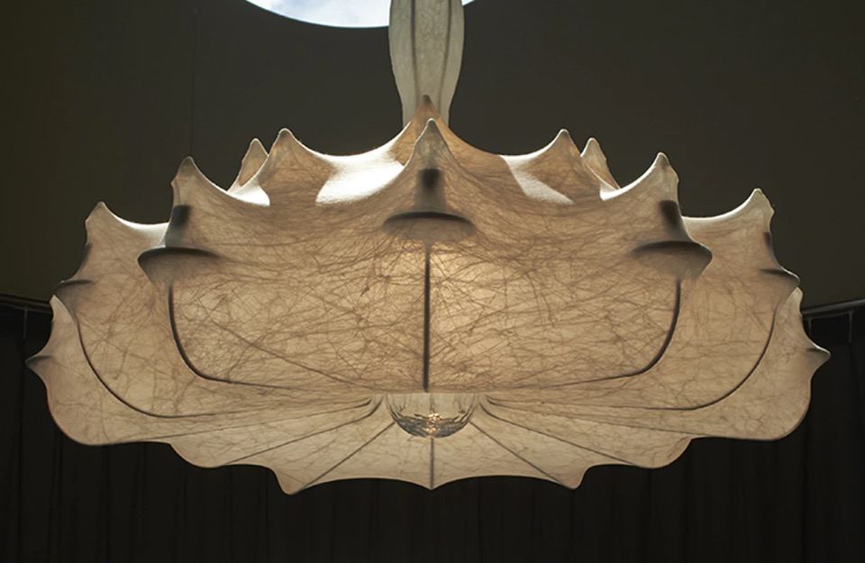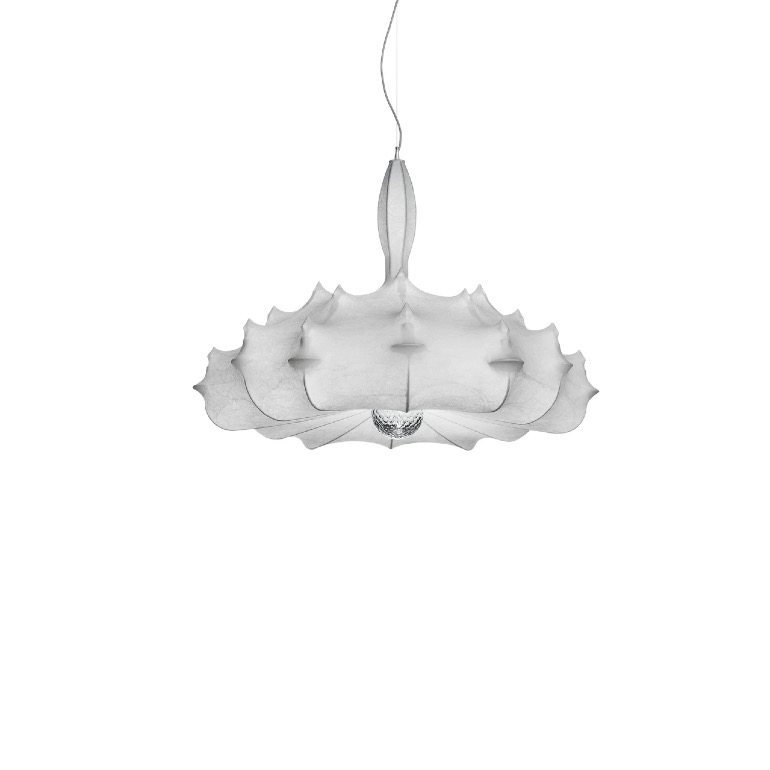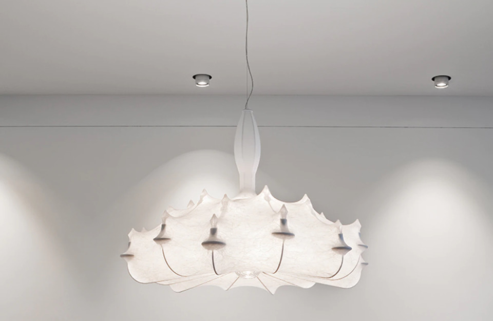 提供漫射照明的吊燈。白色粉末涂層內(nèi)部鋼結(jié)構(gòu)噴涂獨(dú)特的“繭樹脂”,以創(chuàng)建擴(kuò)散器,然后由透明噴涂表面保護(hù)。透明聚甲基丙烯酸甲酯(PMMA)的蠟燭??堂嫠蛭挥谙虏恐行模哂虚W閃發(fā)光的效果。