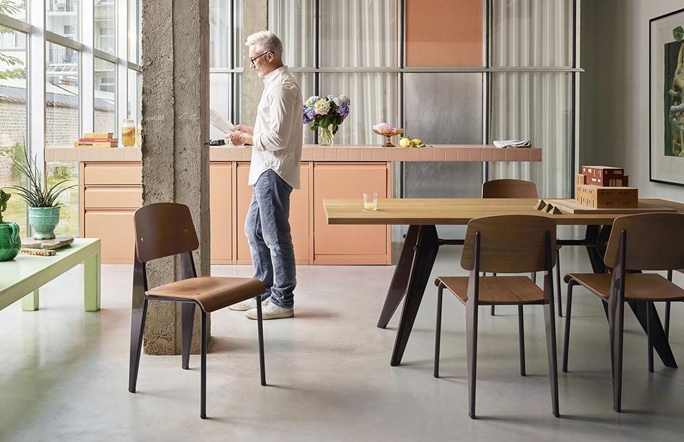 Jean Prouvé 的 Standard 椅子已發(fā)展成為法國“建筑師”最著名的經(jīng)典作品之一。這款低調(diào)的標(biāo)志性椅子的座椅和靠背有各種木材可供選擇,金屬框架有不同的顏色。