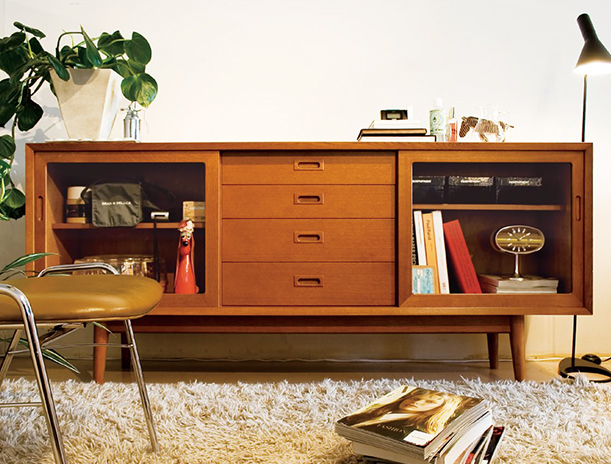 1972 年發(fā)布的餐具柜的復制品。當時,寬敞的客廳里放置一個大餐邊柜是日本生活奢華的象征。在重印中,我們充分利用了干凈的線性設計,并徹底關注抽屜把手等細節(jié),再現了當時的外觀和氛圍。儲藏室內部全部采用天然木材。
