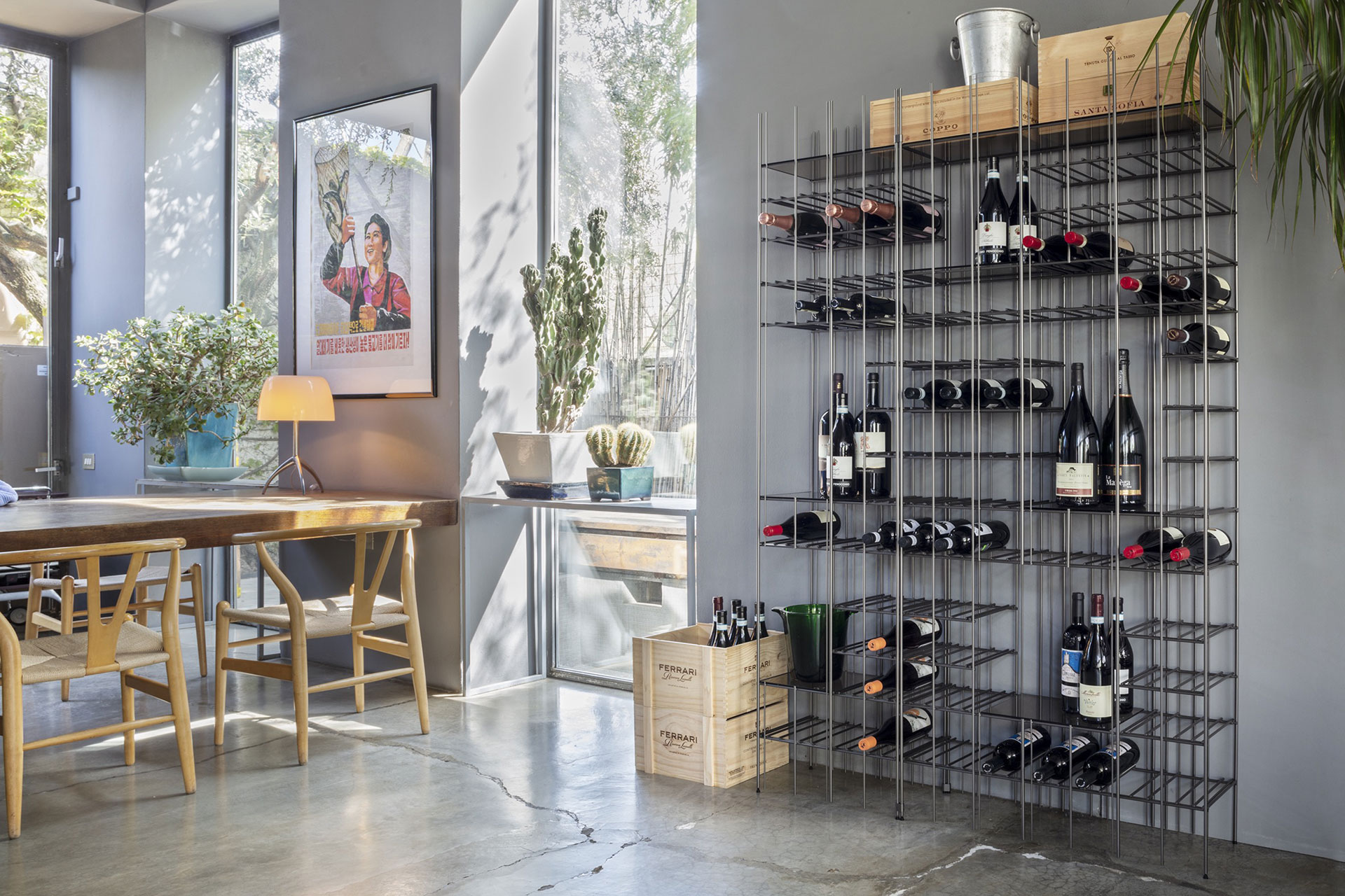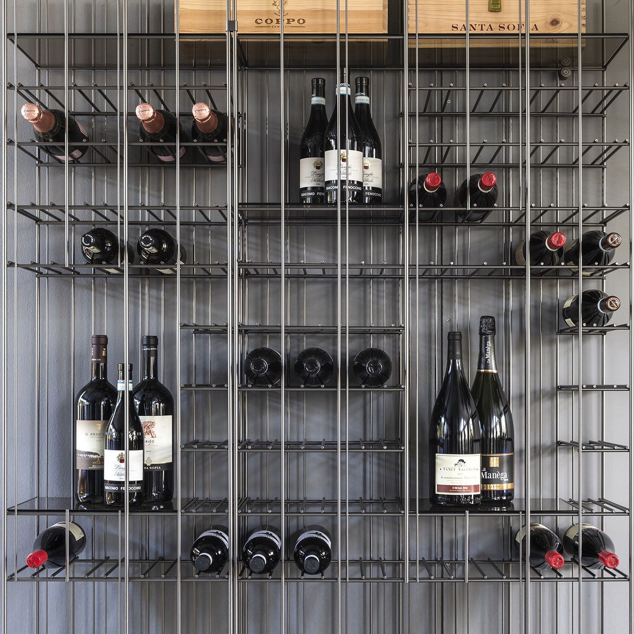 Metrica酒莊是一款結(jié)構(gòu)簡(jiǎn)單的金屬瓶架,以不同間隔固定的鐵棒為節(jié)奏,瓶子和物品在鐵棒內(nèi)完成形狀,不時(shí)書寫新的構(gòu)圖。