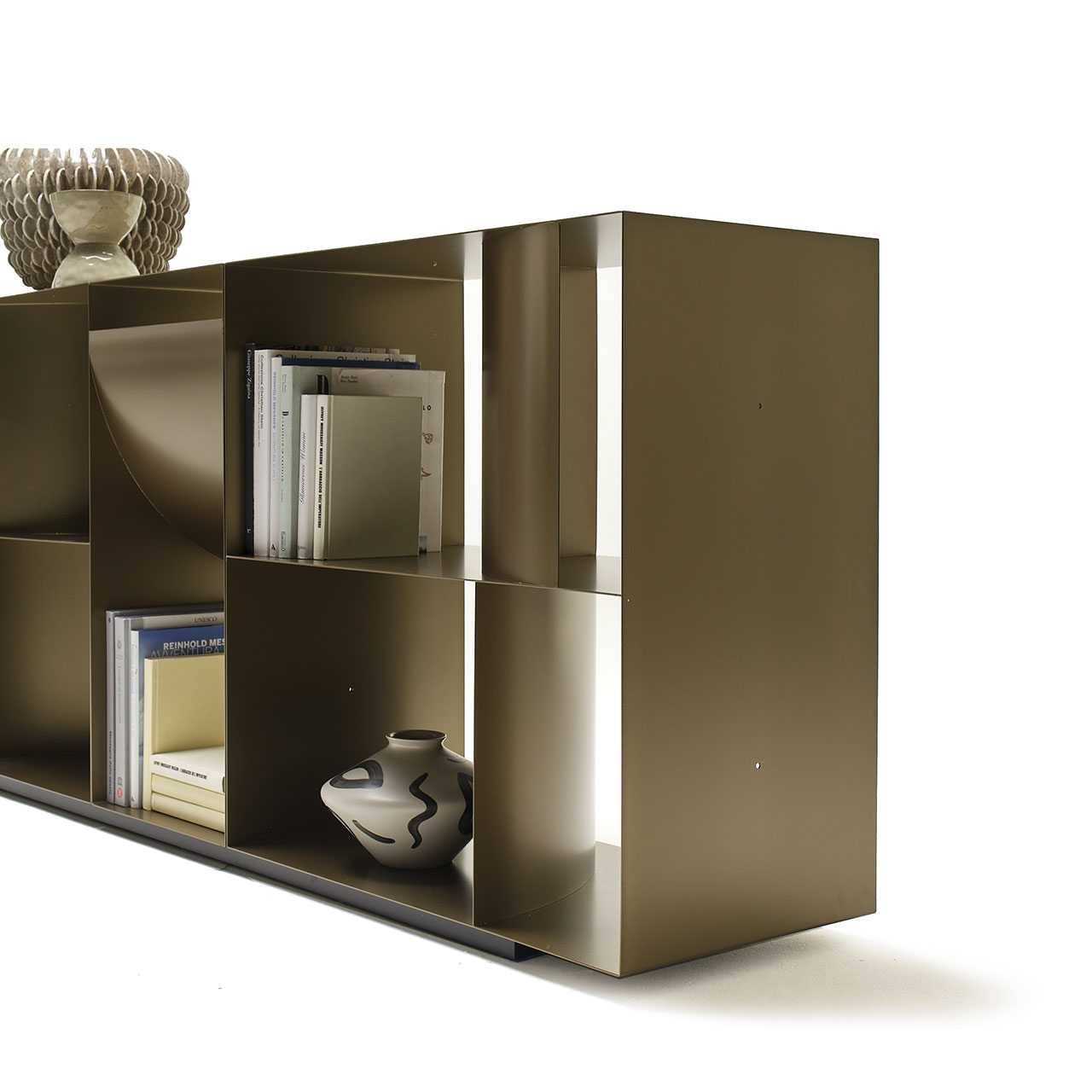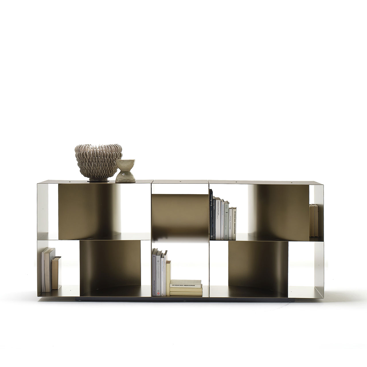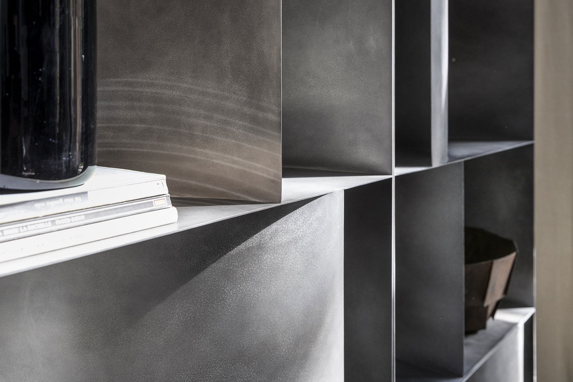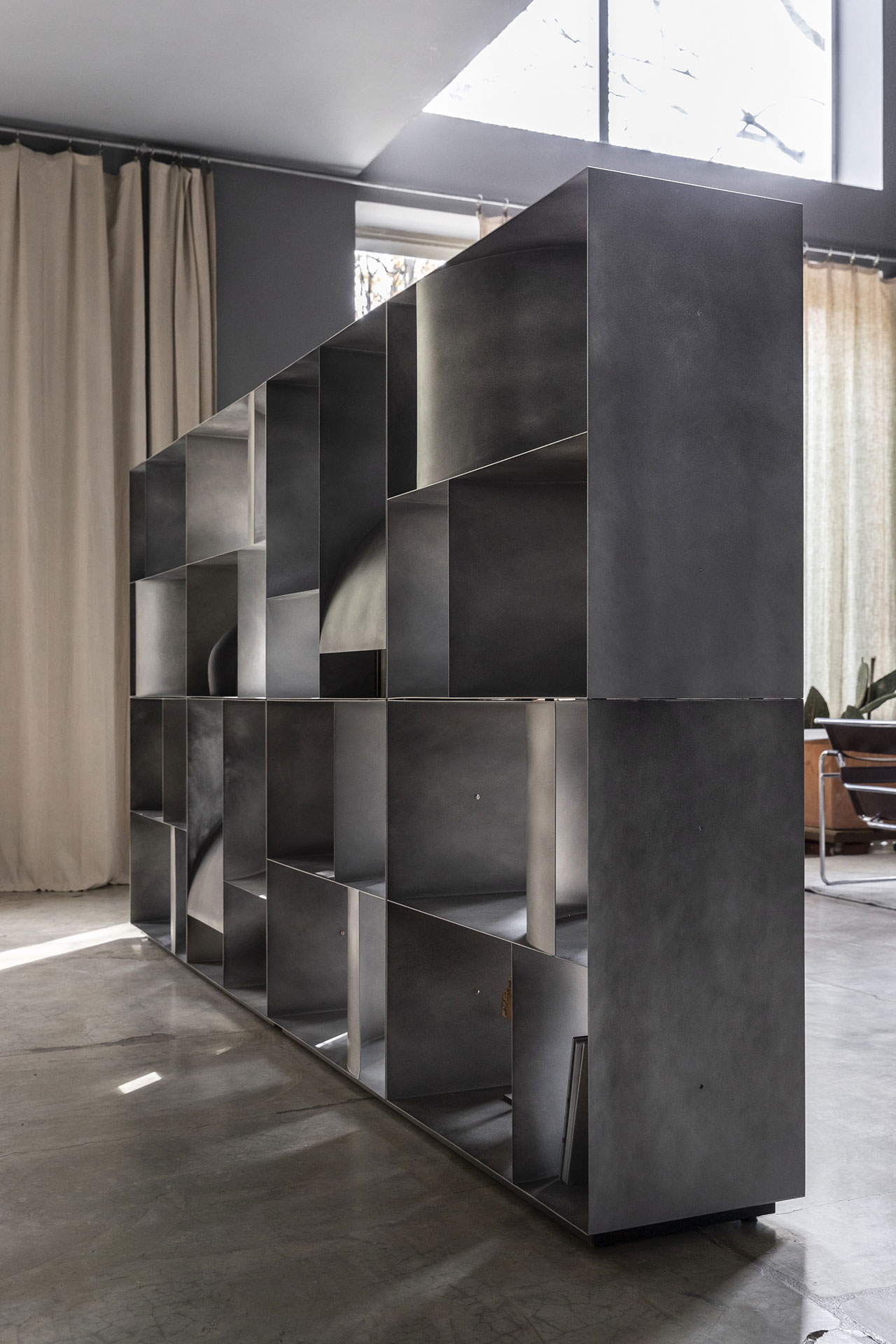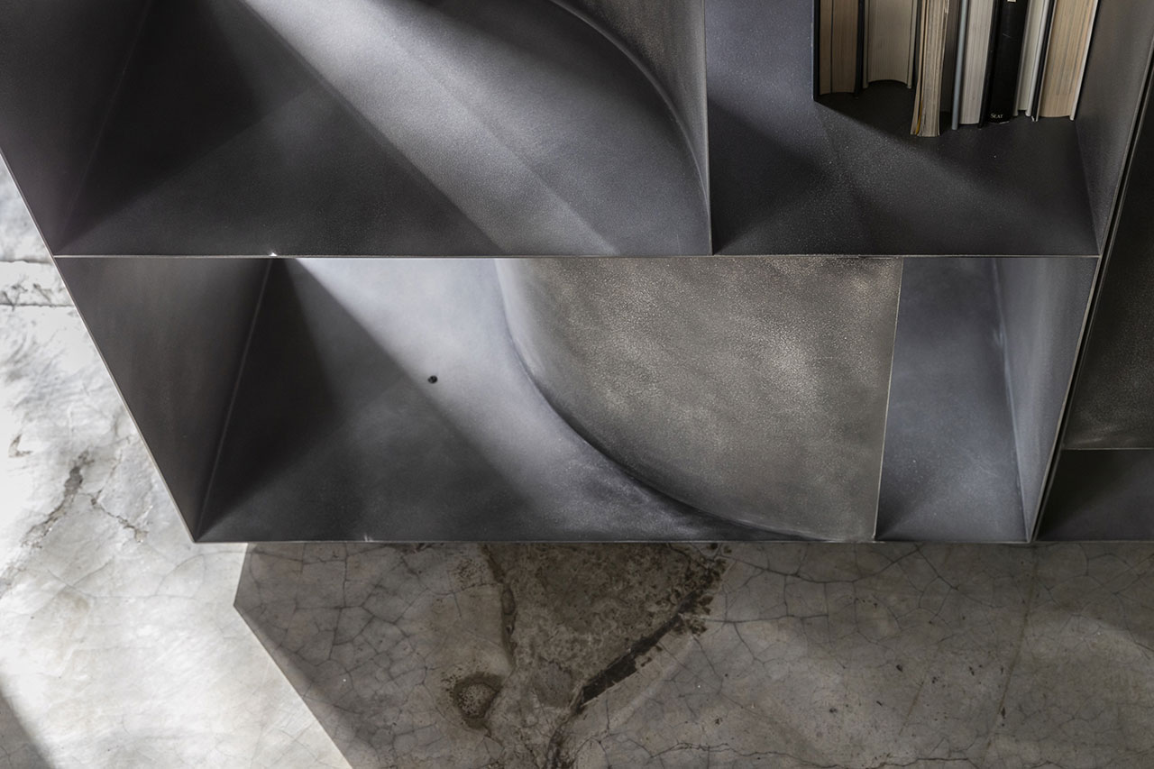 功能性和裝飾性金屬容器,以多功能性的名義組織和標(biāo)記空間。有懸掛式和落地式兩種。這些模塊可以并排放置,創(chuàng)造出無限的組合,適應(yīng)任何空間和需求,在地板版本中,它可以用作分隔大空間的分隔元素。凹凸曲線交替,產(chǎn)生不斷變化的實(shí)體和空隙序列,產(chǎn)生動態(tài)和雕塑元素,自由地裝飾家庭空間。