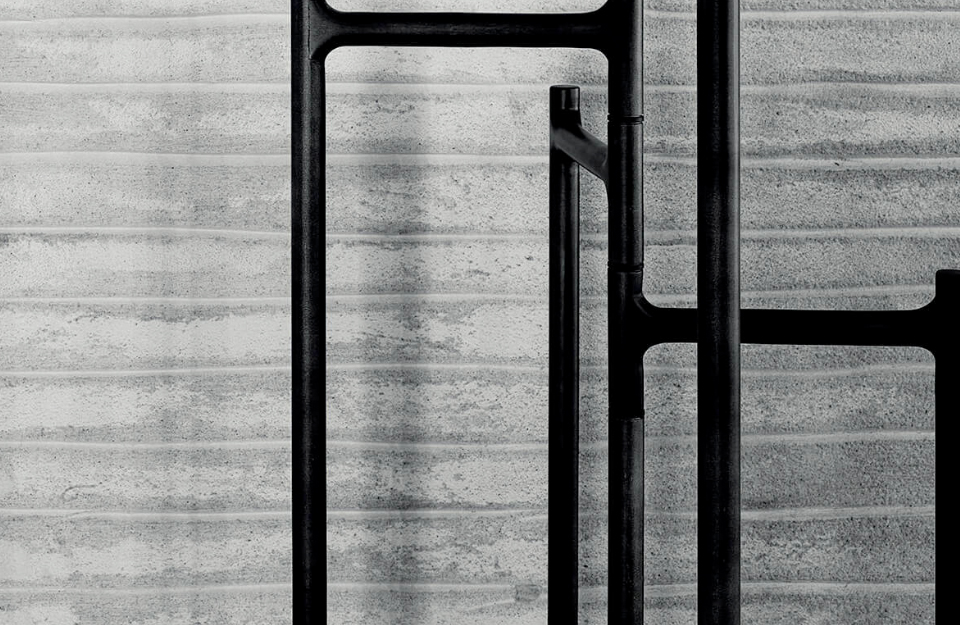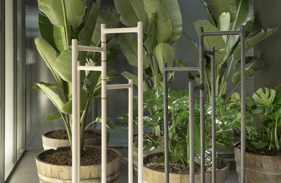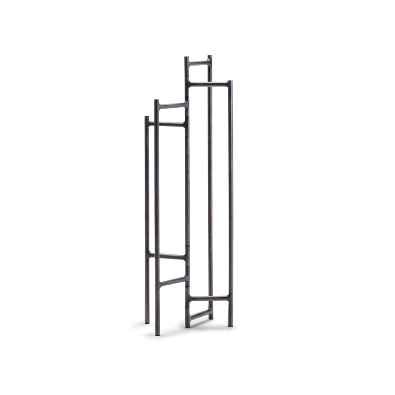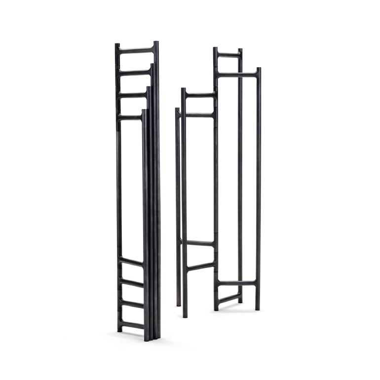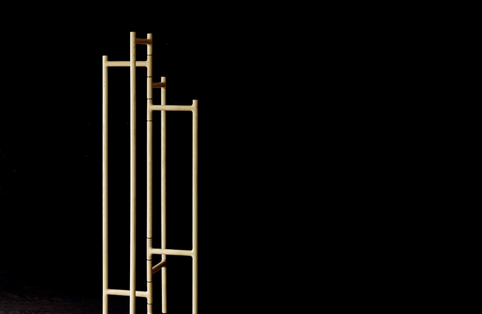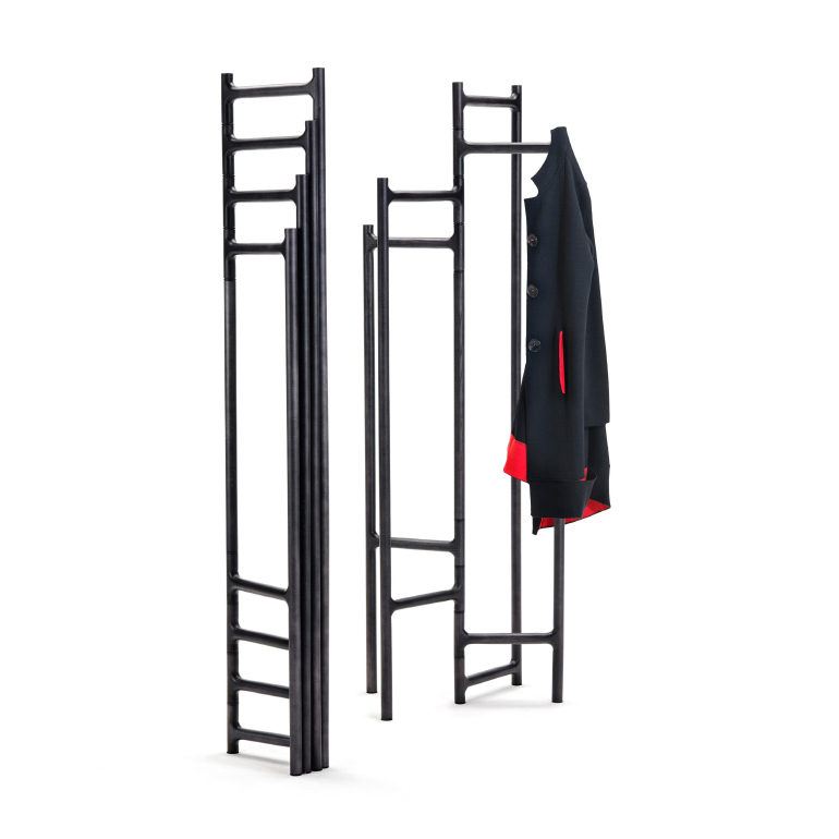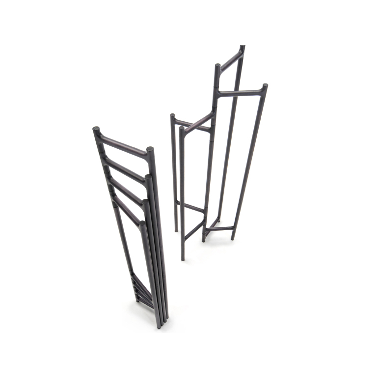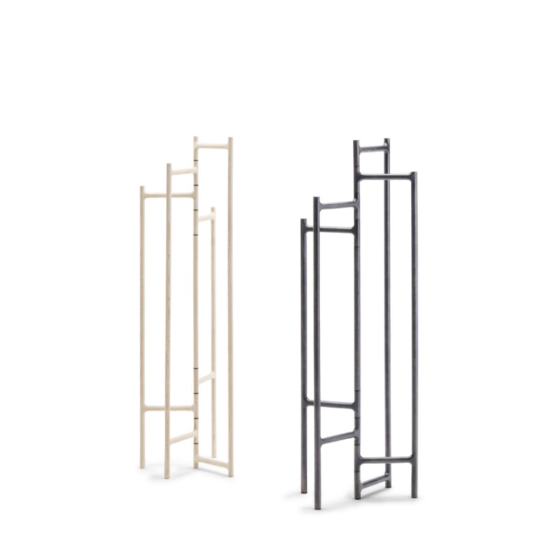 衣架由四個(gè)不同高度的“C 形”元件組成,通過中心銷連接在一起,由于“羅盤”開口,可以將每個(gè)元件放置在不同的位置;推薦的元件之間的打開角度為 90°。該結(jié)構(gòu)由 CNC 機(jī)器制造,然后手動(dòng)完成,采用實(shí)心白蠟?zāi)荆?30 毫米,丙烯酸漆飾面,自然色,丙烯酸水性飾面,或木炭染色,丙烯酸底座和丙烯酸漆飾面。放置在每個(gè)元件之間的 ?30mm 間隔環(huán)采用黑色磷酸鹽涂層鋼制成。