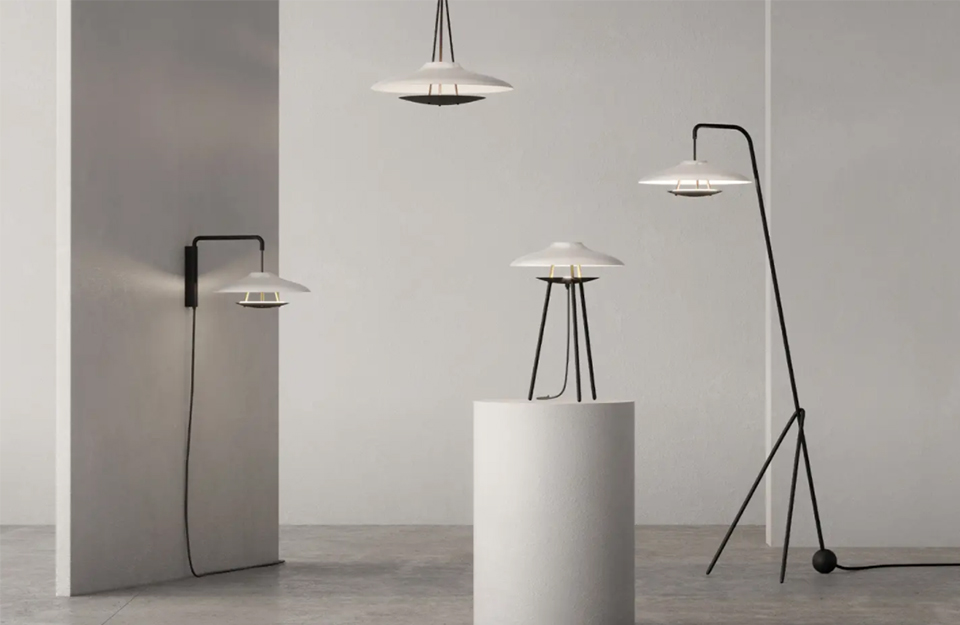“詩意和工業(yè)主題結(jié)合在精致和令人回味的燈具系列Haro中,Haro是以日語中的‘光暈’命名的。”在纖細的磨砂粉末涂層金屬底座上,精致的浮動乳白色玻璃陰影在整個系列中重復出現(xiàn),為多種用途創(chuàng)造了發(fā)光的環(huán)境光層。