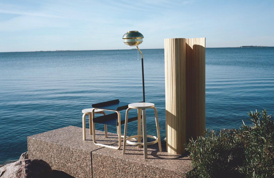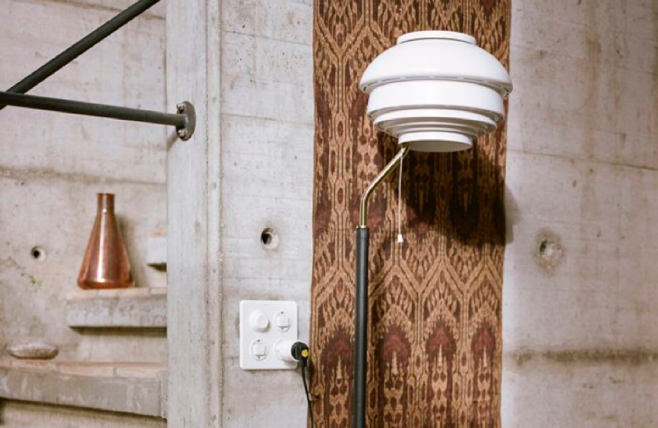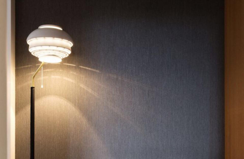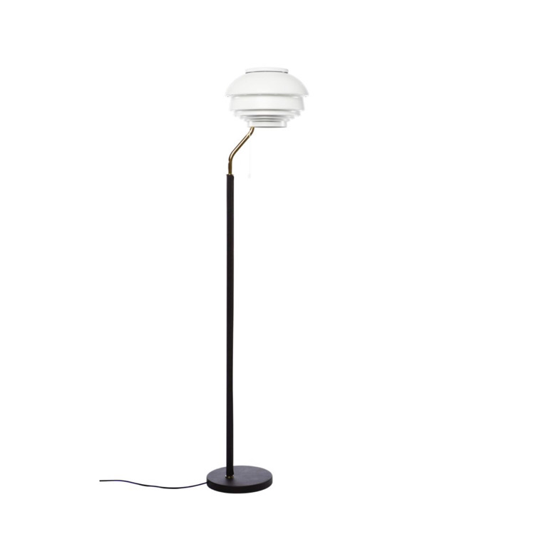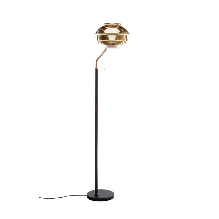 這種優(yōu)雅的落地?zé)舻氖止まD(zhuǎn)動陰影由精致的上漆金屬條制成,通過均勻地散射光線來防止眩光。這些條帶形成越來越大的同心圓,這些圓結(jié)合在一起形成倒置的碗形狀。纖細(xì)的角度頸部有一個拋光的黃銅領(lǐng)子,與支架的黑色皮革飾面形成鮮明對比,后者在芬蘭手工縫制。該燈由Alvar Aalto于1955年為赫爾辛基的國家養(yǎng)老金研究所設(shè)計(jì)。