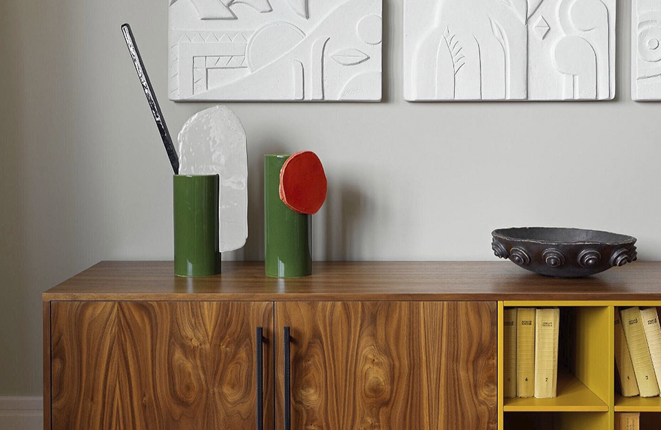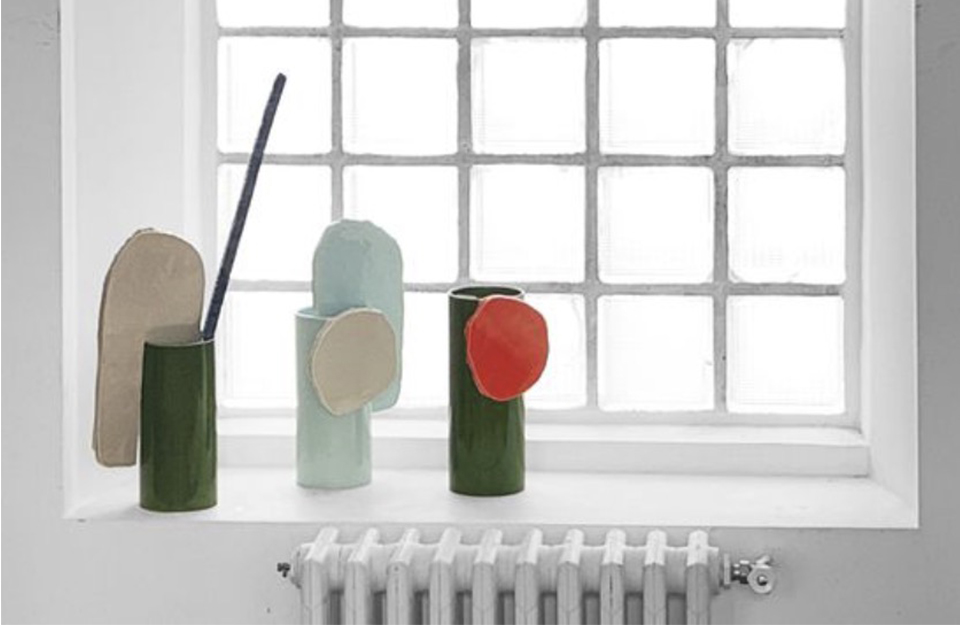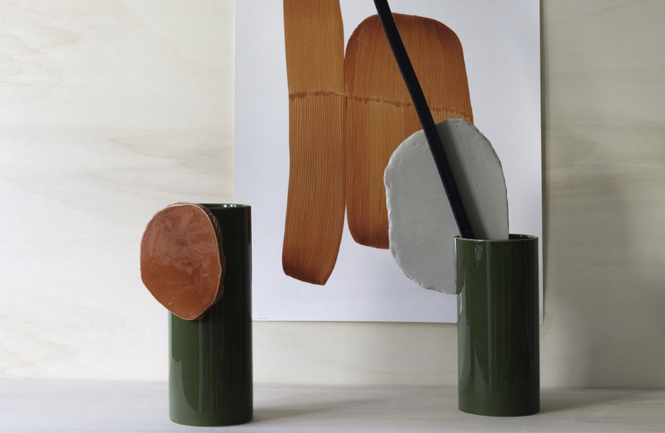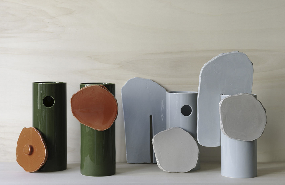 由羅南和埃爾萬·布o(jì)ullec設(shè)計的手工浸漬花瓶Découpage(2020年)是由粘土制成的圓柱體、平板和條形物組成的異想天開、充滿詩意的作品。