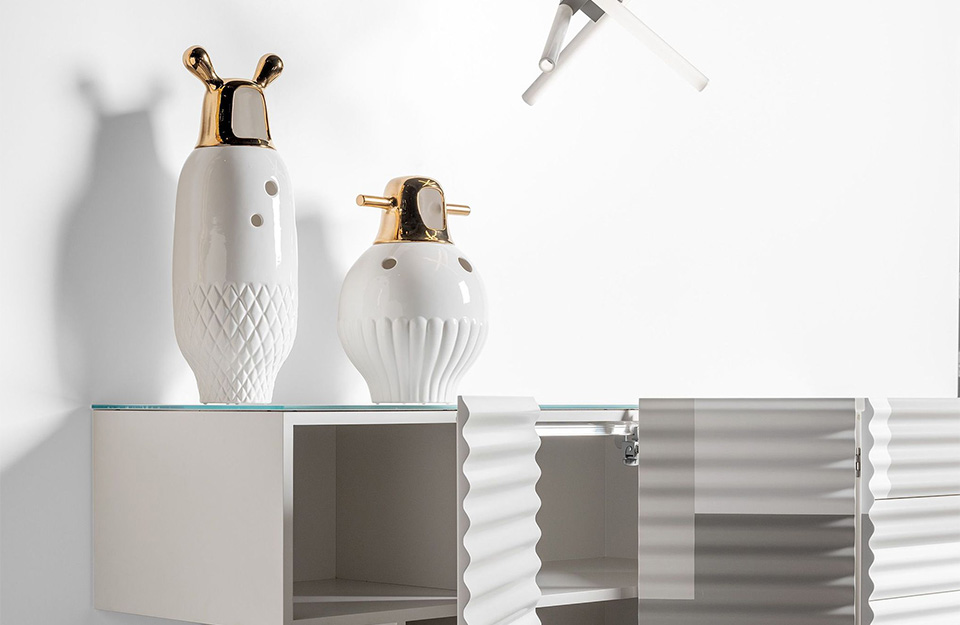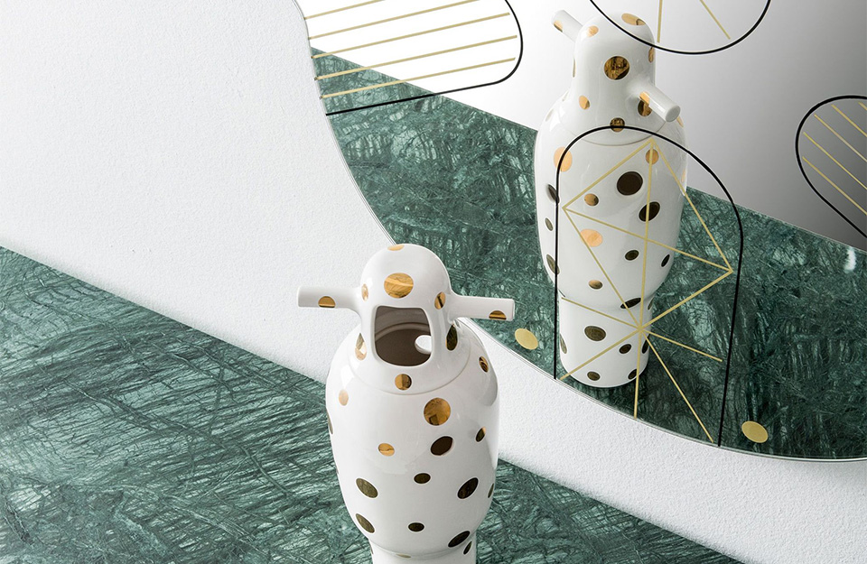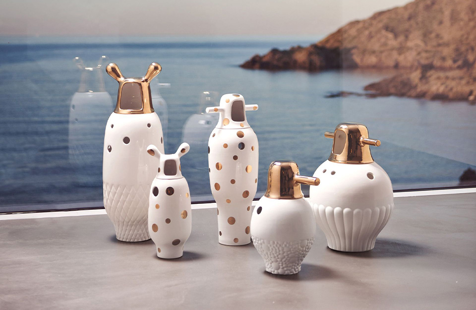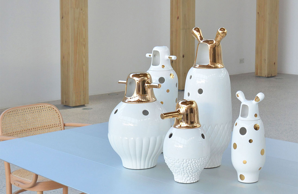 由兩件釉面石器組成,白色飾面和24克拉鍍金裝飾。