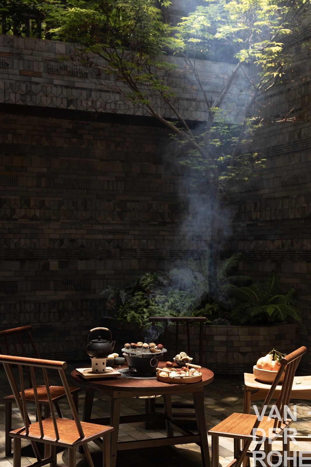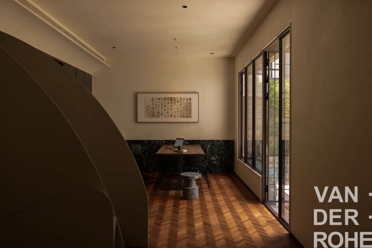 設計師以「錯步借光」的巧思,讓戶外庭院成為室內(nèi)的天然光皿——半下沉的弧形結(jié)構(gòu)微微退讓,既濾去街道喧囂,又將天光云影溫柔收攏。當陽光穿過庭院竹葉,三兩好友倚坐其間,茶盞輕叩木幾,只留下人與天光、草木的私語,人便會會不自覺地放輕呼吸——原來所謂詩意,不過是給生活留一處喘息的留白。