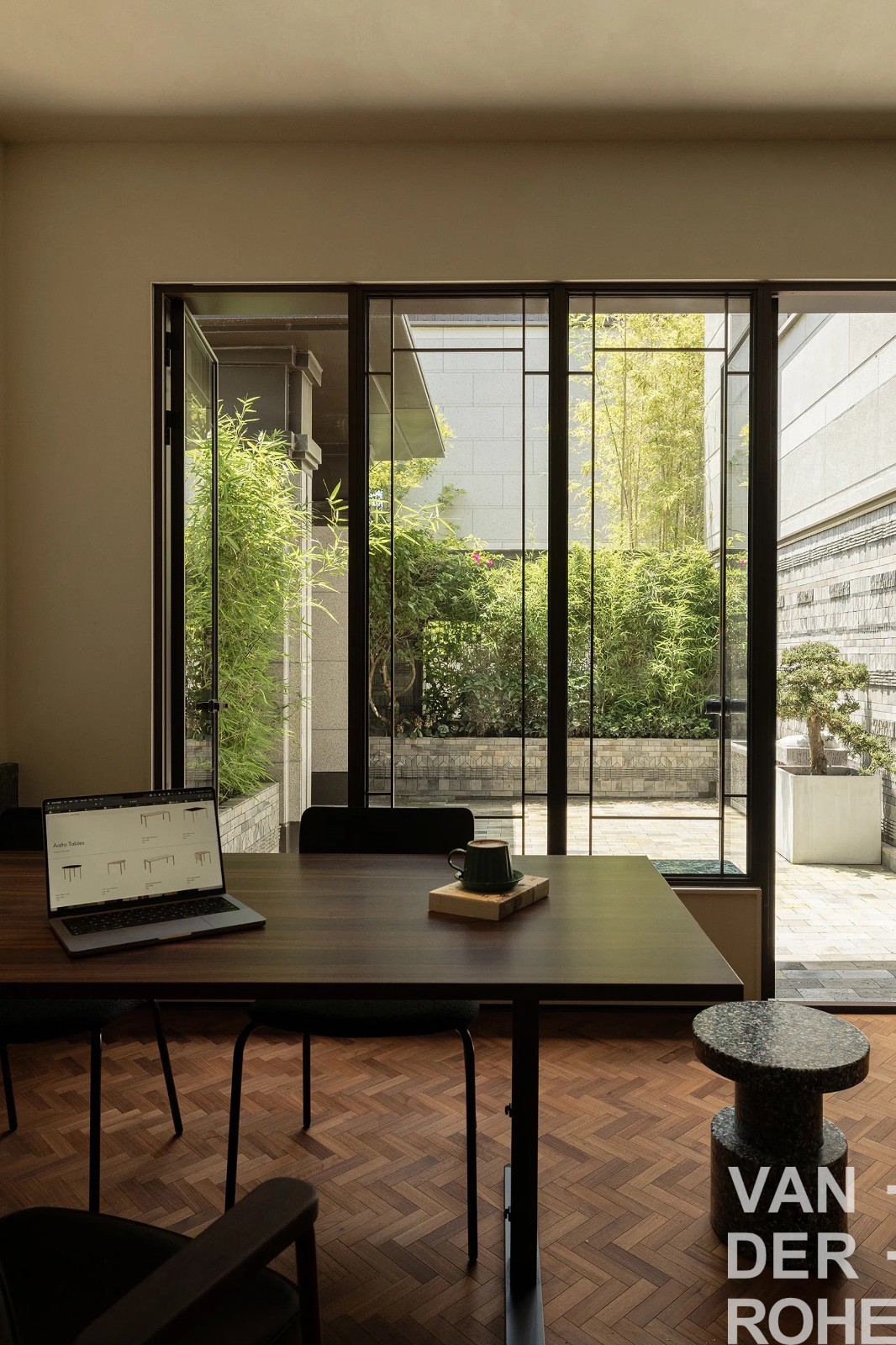 多功能學習室與入口庭院相連,設計師刻意模糊功能區(qū)的邊界,讓茶水區(qū)的蒸汽氤氳能漫入書頁,讓庭院的綠意可隨意攀上窗沿。創(chuàng)造「不打擾的陪伴」。