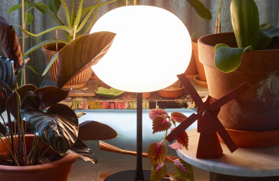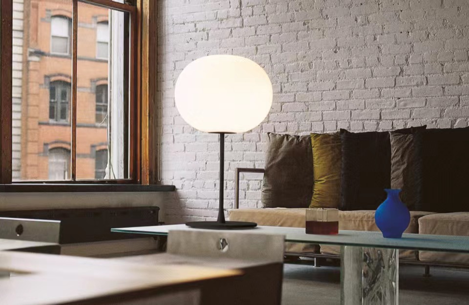 提供漫射光的臺(tái)燈/臺(tái)燈。擴(kuò)散器由外部酸蝕刻,手工吹制,閃光的乳白色玻璃和具有醛鍍表面的壓鑄螺紋環(huán)形螺母組成?;疑蚝谏科岬母吆穸蠕摰鬃烷y桿以及壓鑄鋁擴(kuò)散器支架。電纜上有電子調(diào)光器,可以調(diào)節(jié)光亮度。