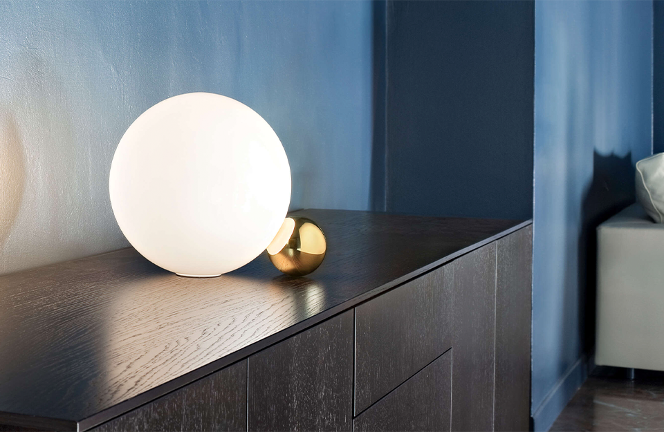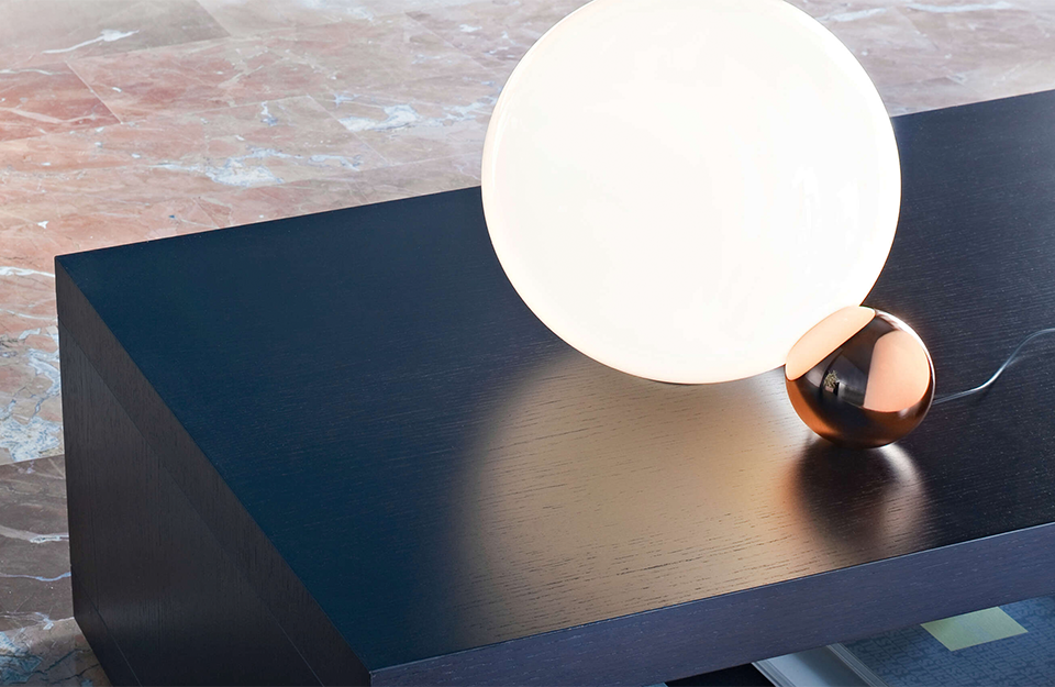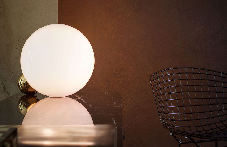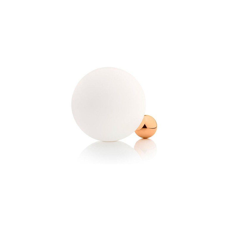 臺式照明裝置包括一個由固體加工而成的鋁球體,然后涂上24K金。吹制玻璃蛋白石擴(kuò)散器。電源線上有調(diào)光開關(guān)的LED光源。