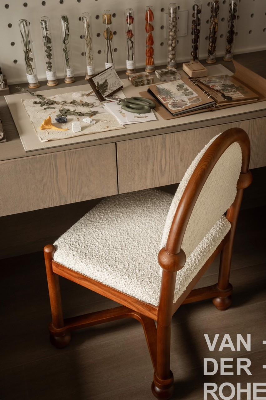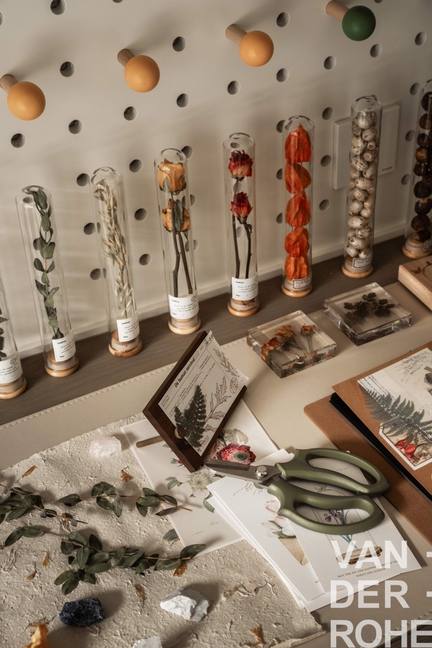而設(shè)計(jì)師在這個(gè)空間里打破了社會(huì)環(huán)境的桎梏,給出了溫柔的反叛。當(dāng)黃昏的光斑在標(biāo)本墻上跳舞,當(dāng)手指撫過尤加利葉標(biāo)本的瞬間。從一片葉子中,窺見整株植物的生命力,也在這個(gè)空間里證明著,人類依然保有將機(jī)械生存重新「野化」為詩意棲居的能力。