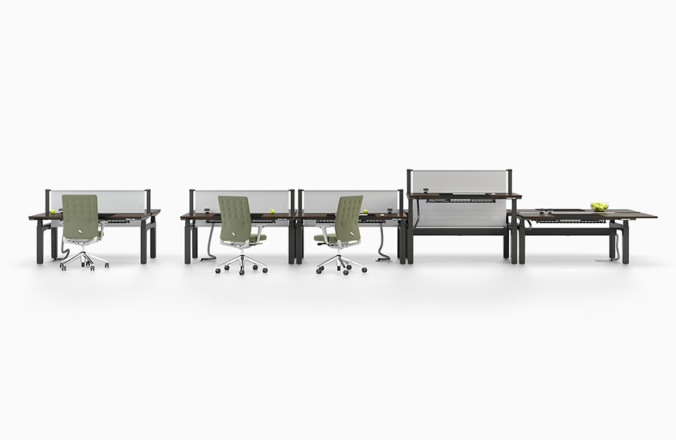 CDS 桌系統(tǒng)還包括坐高版本的會(huì)議桌以及可調(diào)節(jié)高度的模型。他們的設(shè)計(jì)與工作站相同,為工作區(qū)和會(huì)議區(qū)提供兼容的家具。