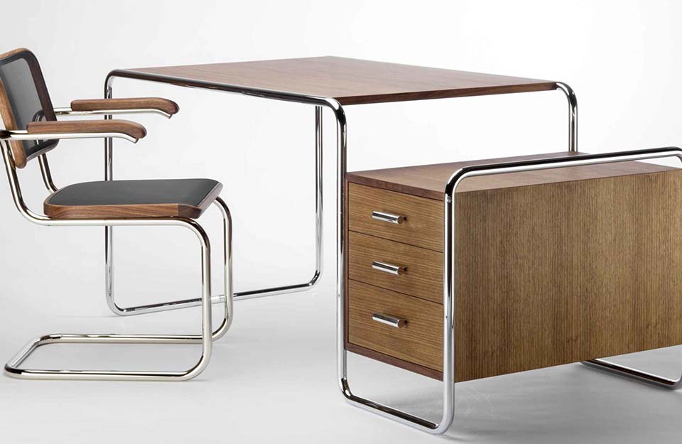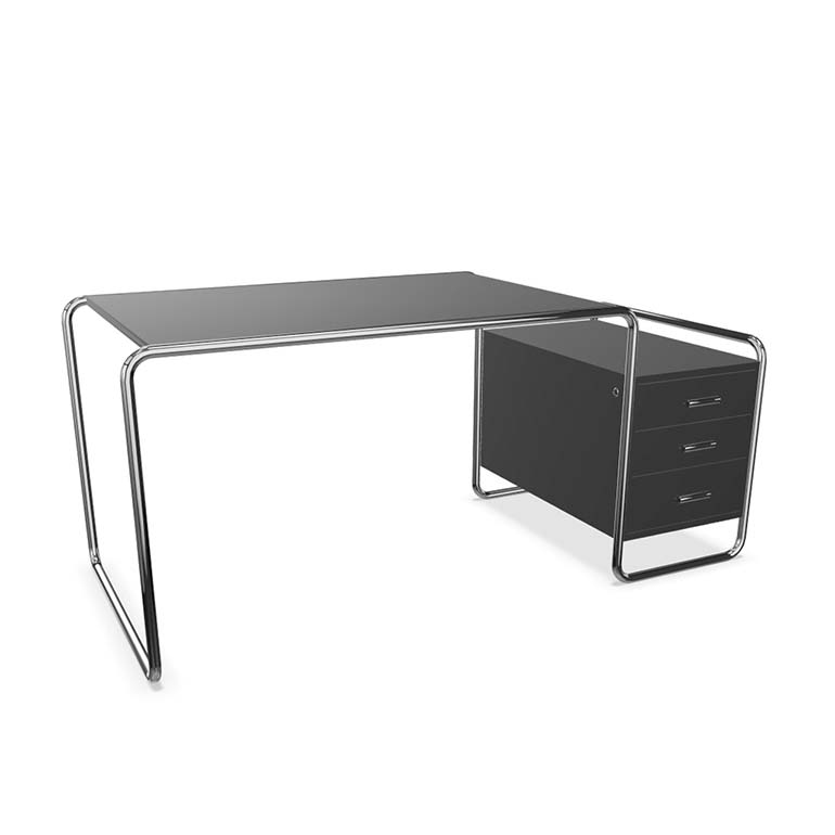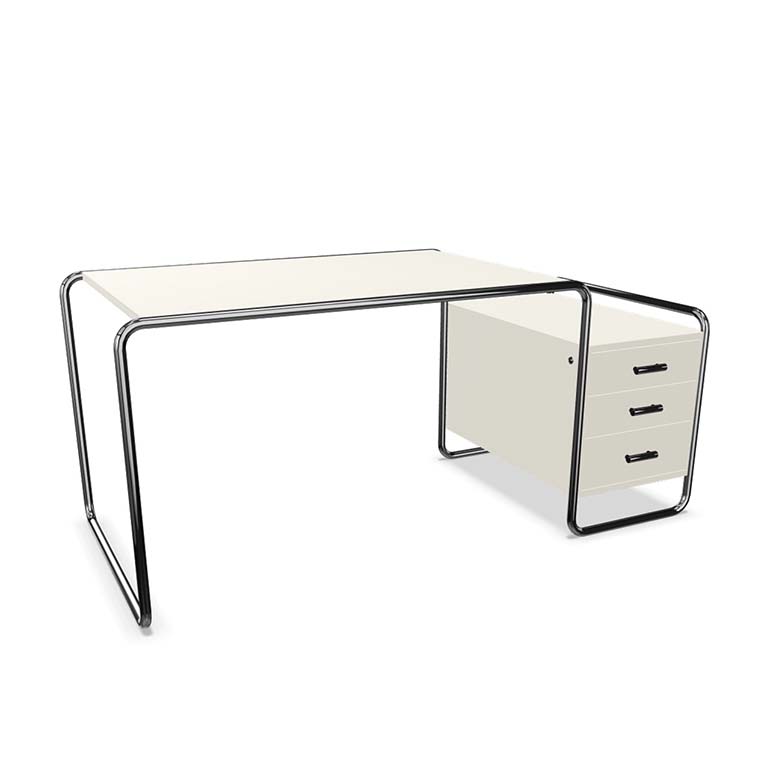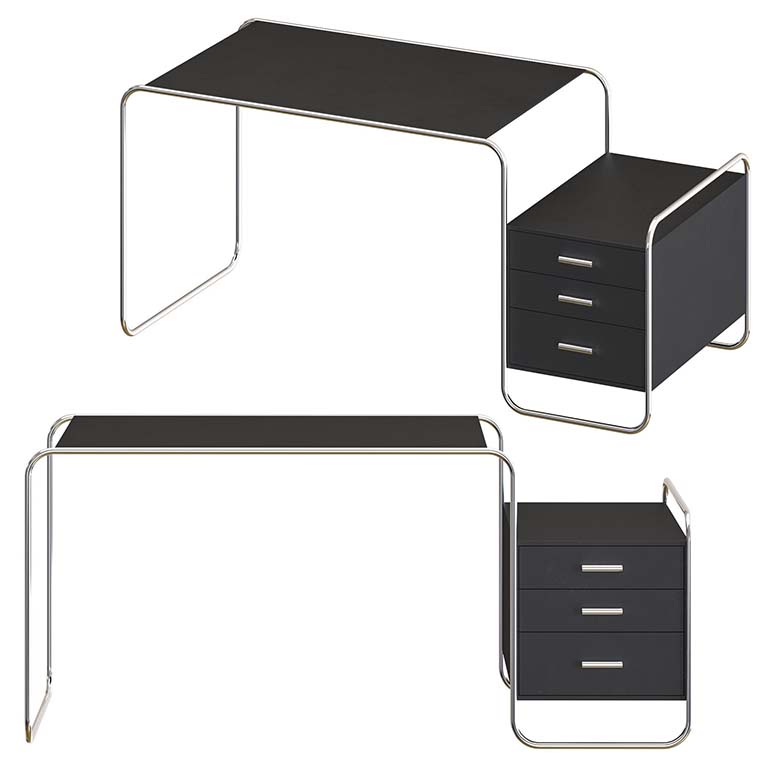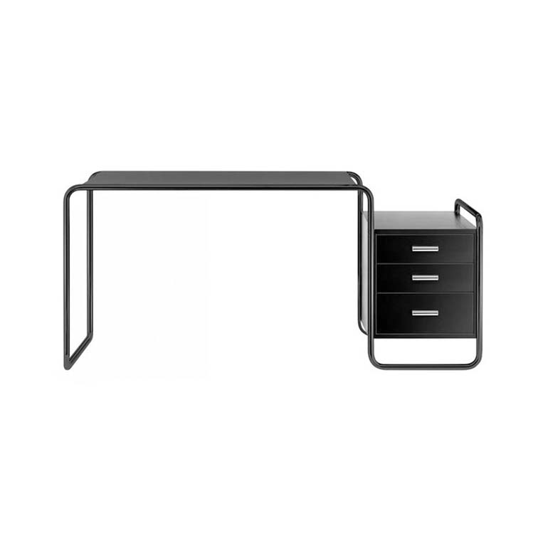 憑借他在室內(nèi)設(shè)計(jì)方面的經(jīng)驗(yàn)。桌面和存儲(chǔ)元件由上漆或染色木材制成,與管狀鋼框架和諧配合。支撐框架由一條曲線組成,以清晰形式為特征的木質(zhì)元素似乎漂浮在其中。這件比例正式平衡的家具代表了當(dāng)代歷史的一個(gè)重要部分,被稱為“新客觀性”。Thonet生產(chǎn)這種引人注目的模型的各種版本。