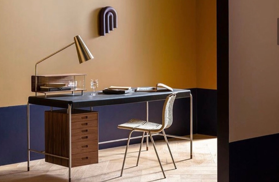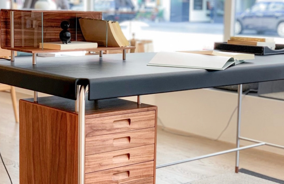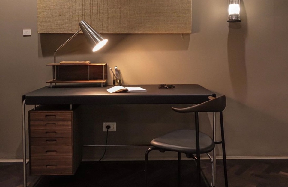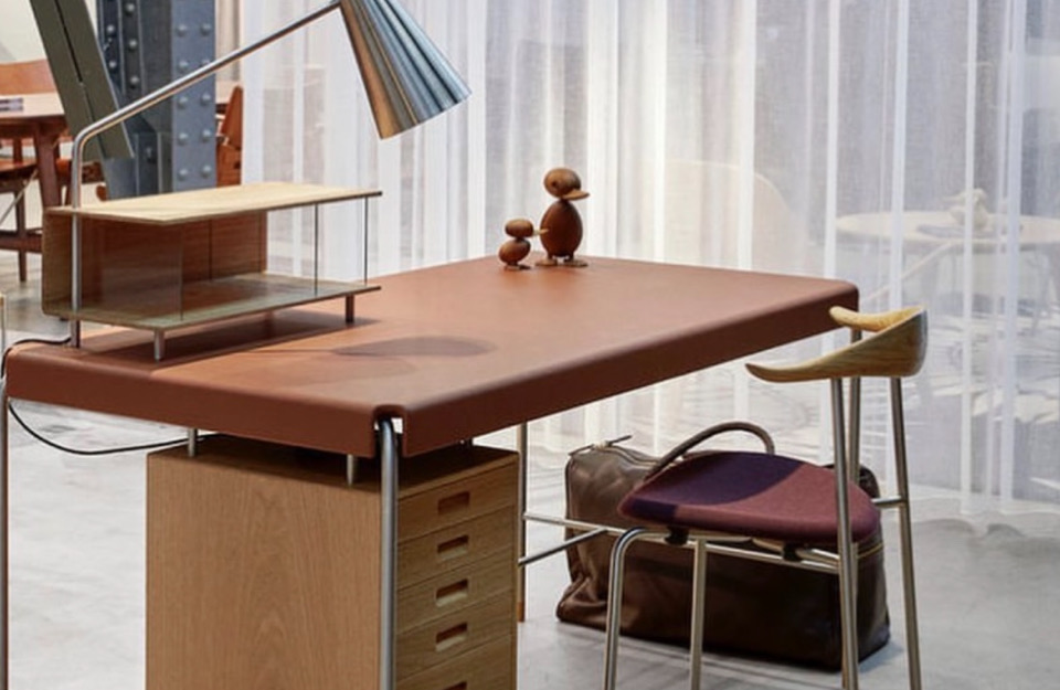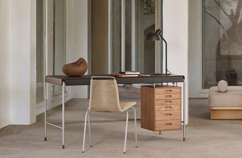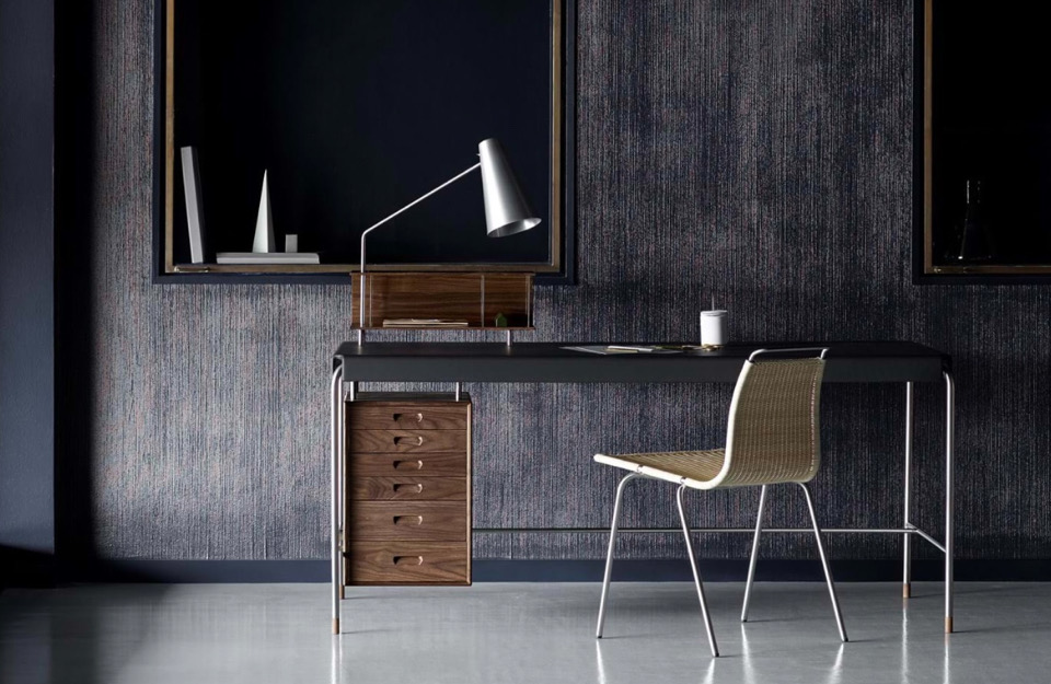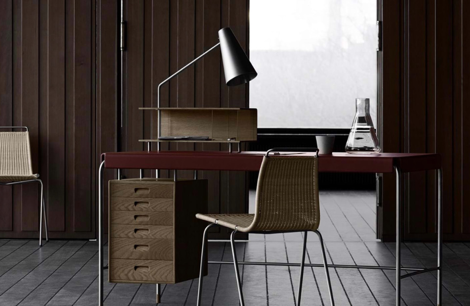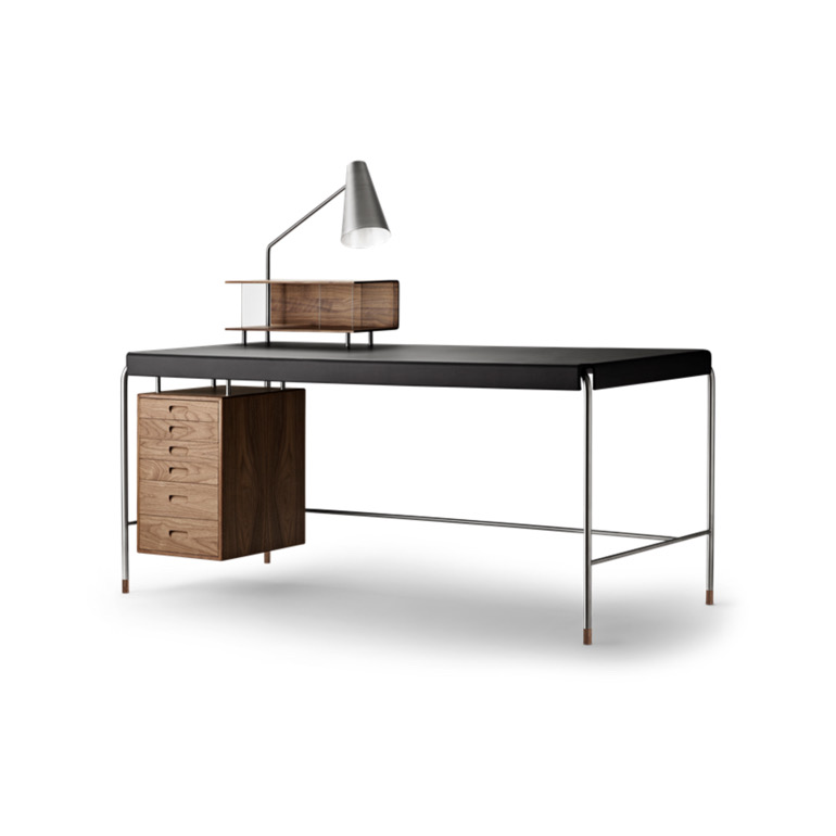 阿恩·雅各布森(Arne Jacobsen)設(shè)計的AJ52“社會桌”(Society Table)擁有皮革桌面、細(xì)長管狀框架和實木抽屜,它在1952年被委托作為禮物送給美國斯堪的納維亞基金會(American-Scandinavian Foundation),如今依然引人注目。細(xì)長的寫字臺有六個抽屜單元,有實心橡木、胡桃木或黑漆橡木抽屜,并配有實木腳。它有兩種尺寸——這是兩種尺寸中較小的一種,尺寸為140 x 70厘米。圓錐形不銹鋼燈是可選的,前面是玻璃的木制櫥柜,是完美的比例的信件和信封。